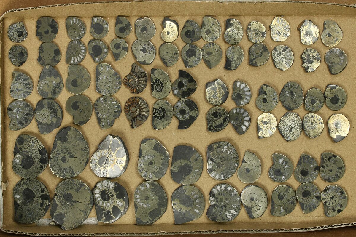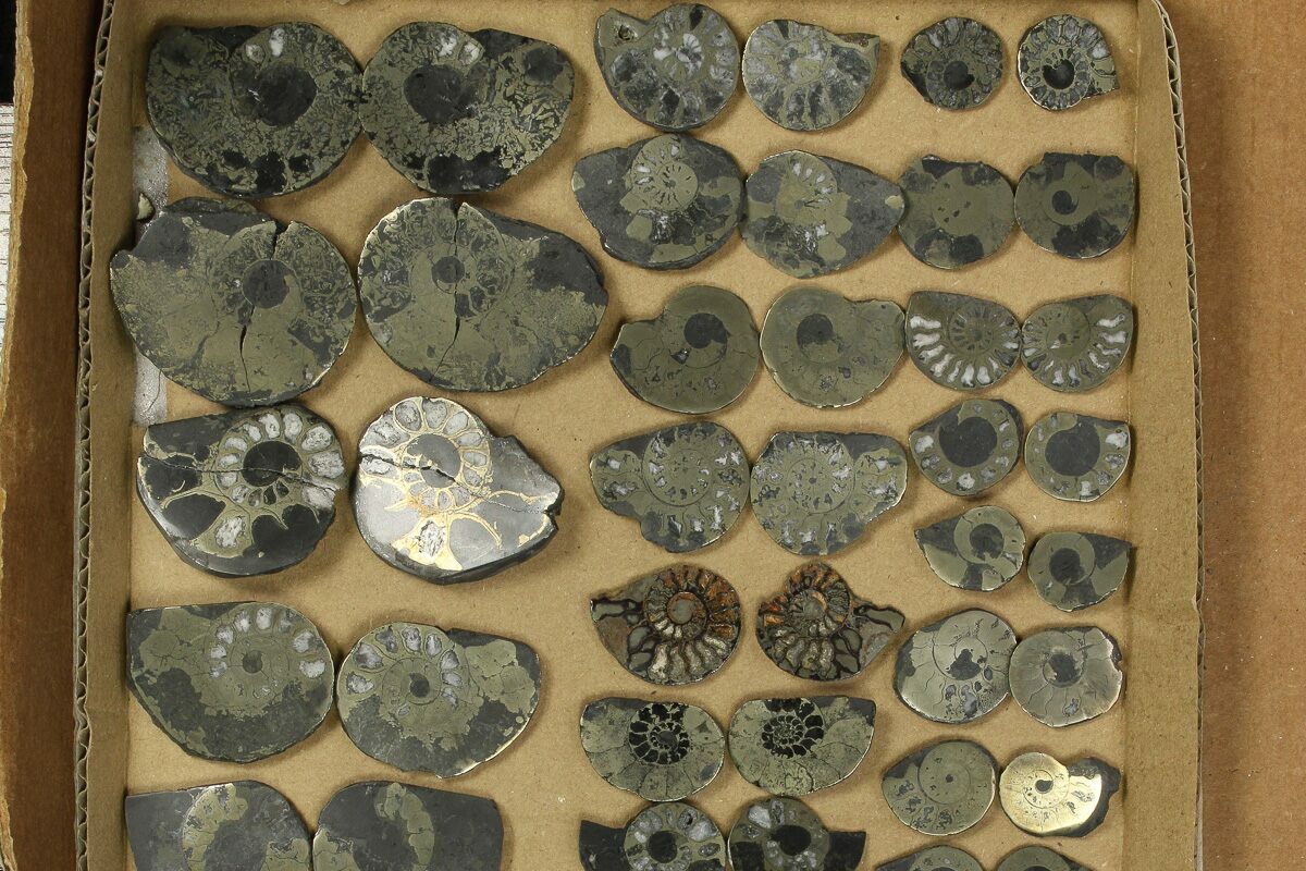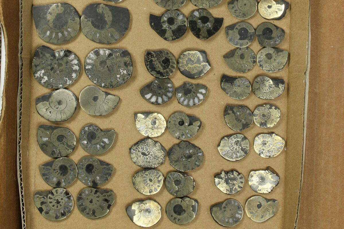 This is a wholesale lot of Cretaceous-aged, cut and polished ammonite fossils from Morocco. The lot includes 37 pairs of ammonites ranging from .9" to 2" wide. The partial pyrite replacement gives them a wonderful luster.