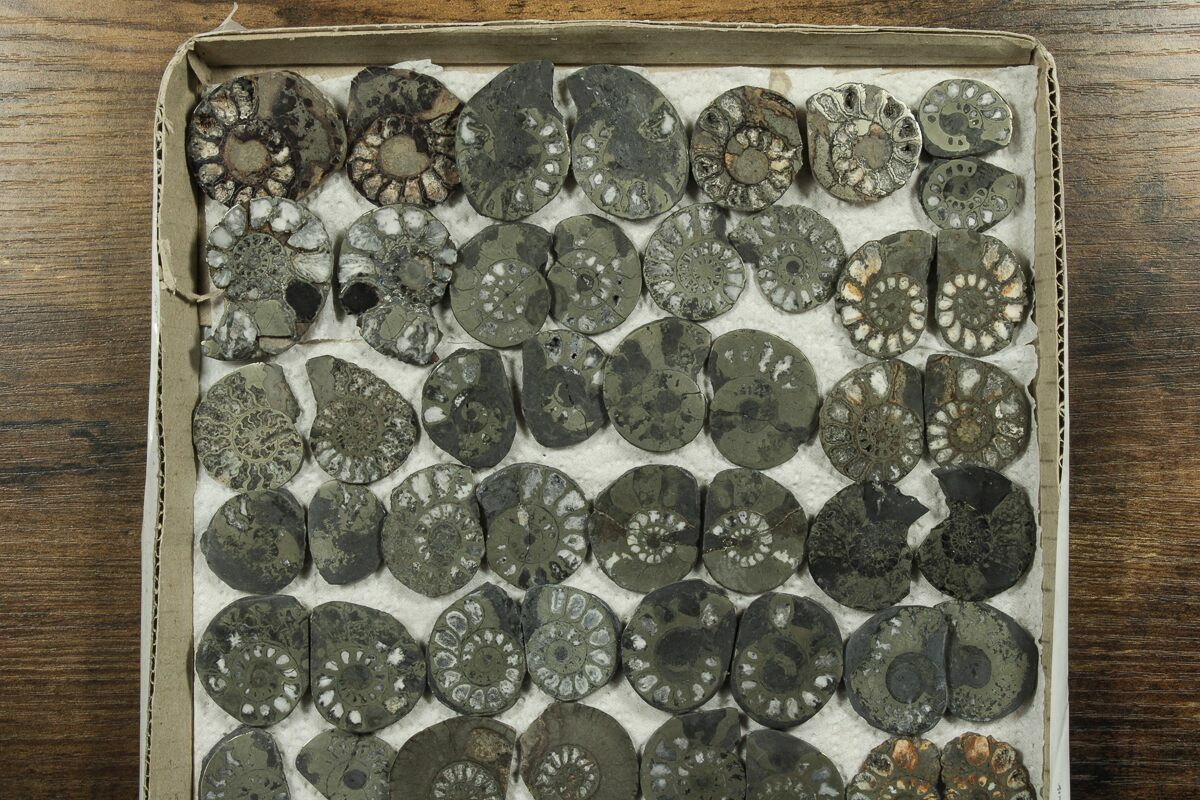 This is a wholesale lot of Cretaceous-age, cut and polished ammonite fossils from Morocco. The lot includes 46 pairs of ammonites ranging from 1" to 1.6" wide. The partial pyrite replacement gives them a wonderful luster.