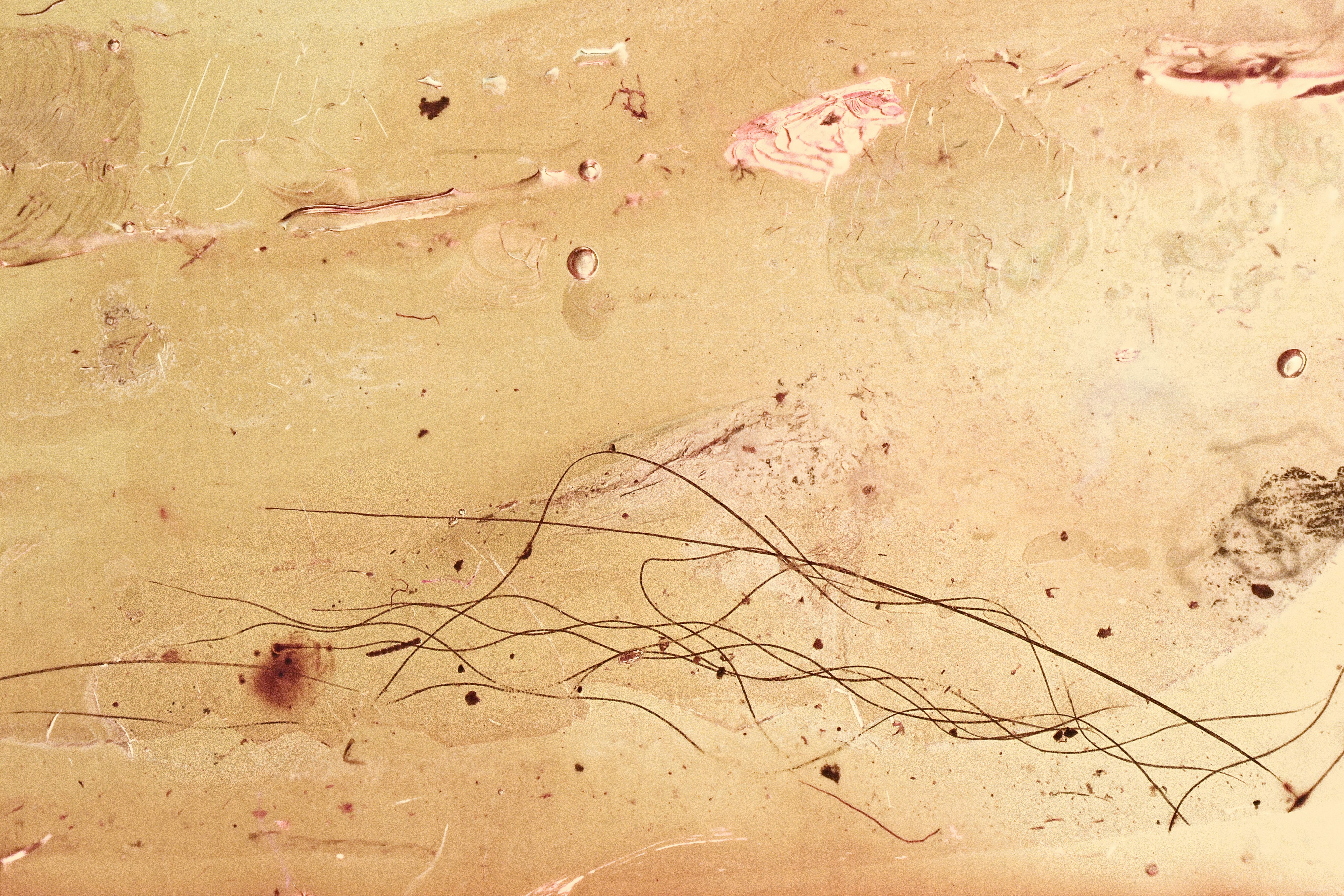 These are small, 44 million year old mammalian hair strands preserved in Baltic Amber.