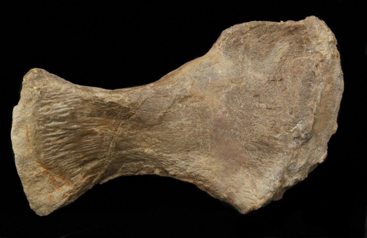 This is a radius (limb bone) of Platecarpus as type of Mosasaur. It comes from the Late Cretaceous, Smoky Hill Chalk in Gove County, Kansas.