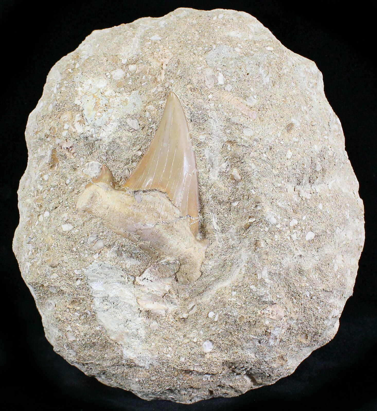 This is a beautiful fossil of the extinct, giant mackerel shark, Otodus obliquus. It's Eocene in age, approximately 54 million years old and comes from the phosphate deposits in the Oulad Abdoun Basin of Morocco. This tooth is still embedded in the natural matrix it was found in.