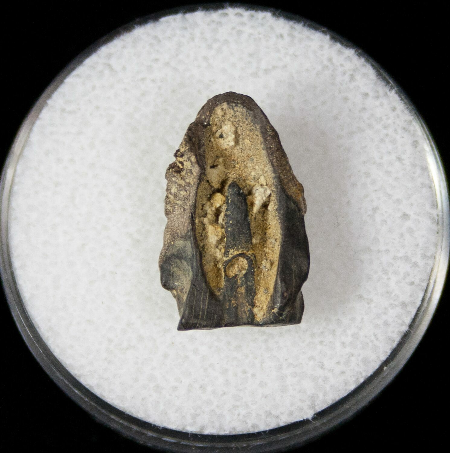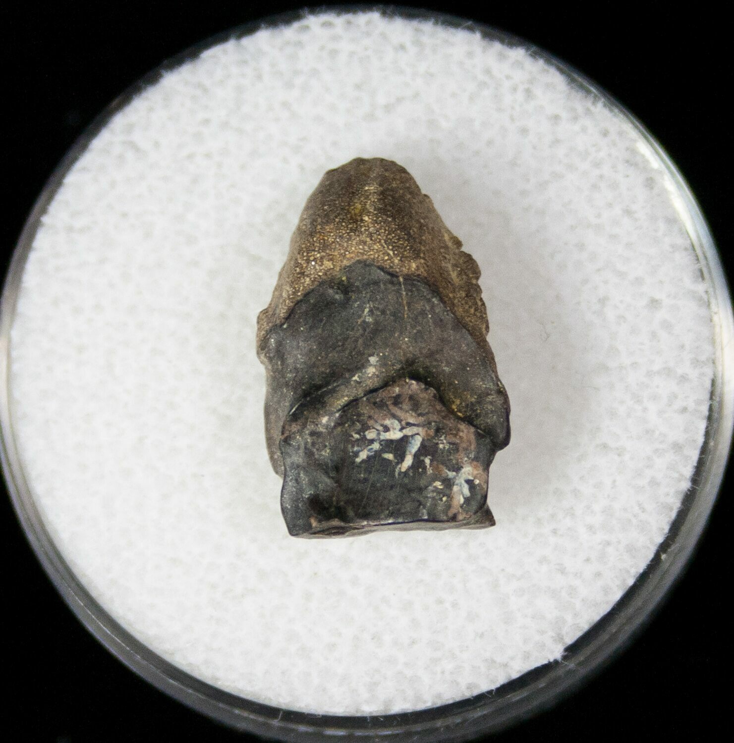 Here's a real tooth from one of the most iconic dinosaurs, Triceratops. It was collected in the 66 million year old, Hell Creek Formation in Carter County, Montana. Triceratops had a massive battery of teeth in their mouth for chewing the rough vegetation that made up their diet. As these teeth became worn or the dinosaur grew they shed their teeth. This is one of the shed teeth.