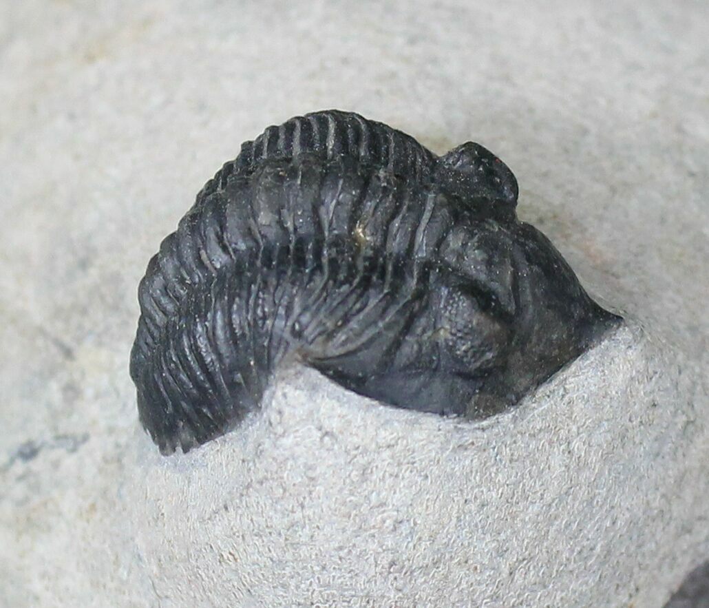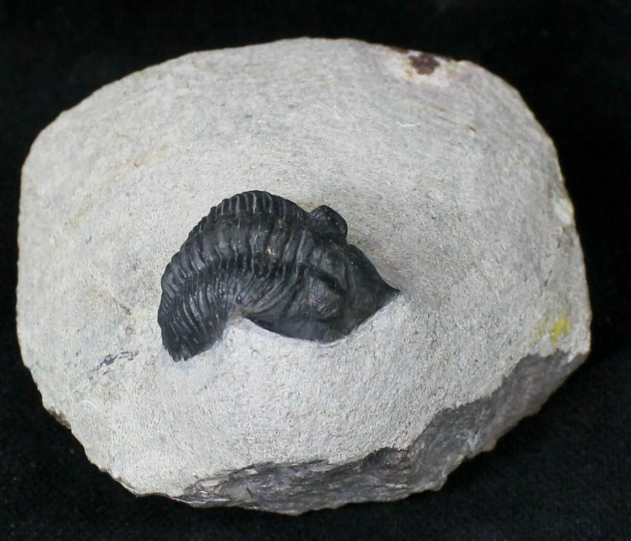 This is a fine specimen of Pseudocryphaeus formerly named Cryphina from Atchana, Morocco. The rostrum is different (shorter) than that of Pseudocryphaeus minimus, so I'm not sure if it would be considered a variation on the species or represents a different species. The specimen would be 1" long if outstretched, is arched over on the rock and nicely prepared.