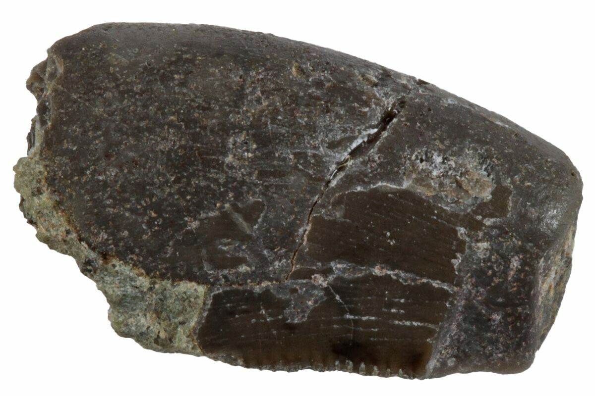 There are two main characteristics that distinguish it from the much more frequently found Allosaurus teeth. First, the serrations on the mesial edge of the tooth extend less than half way down the length of the tooth. Secondly, there is little to no spiraling of the serrations as seen on Allosaurus teeth. Additionally, it's also fairly thin in cross-section and has a hooked profile.
