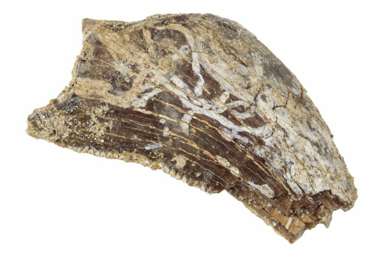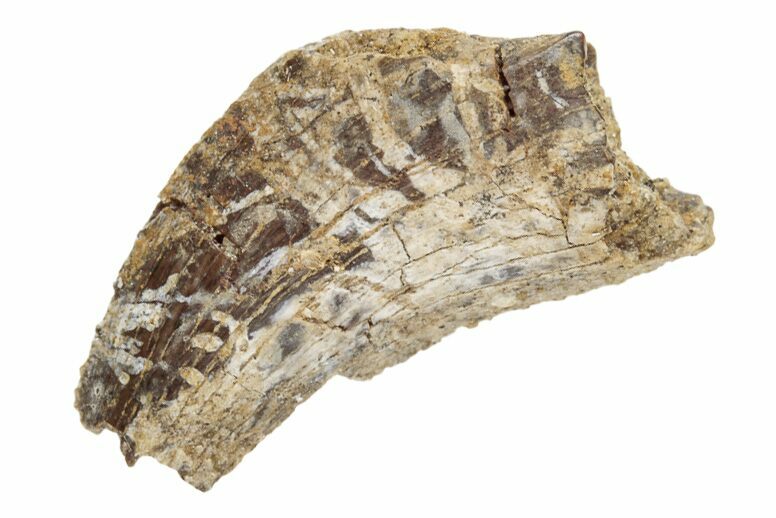 This is a .52" long partial Tyrannosaur tooth likely of the species Nanotyrannus lancensis, collected from the Hell Creek Formation of Eastern Montana. The enamel and serrations of this tooth are weathered and the apical and basal ends are damaged.