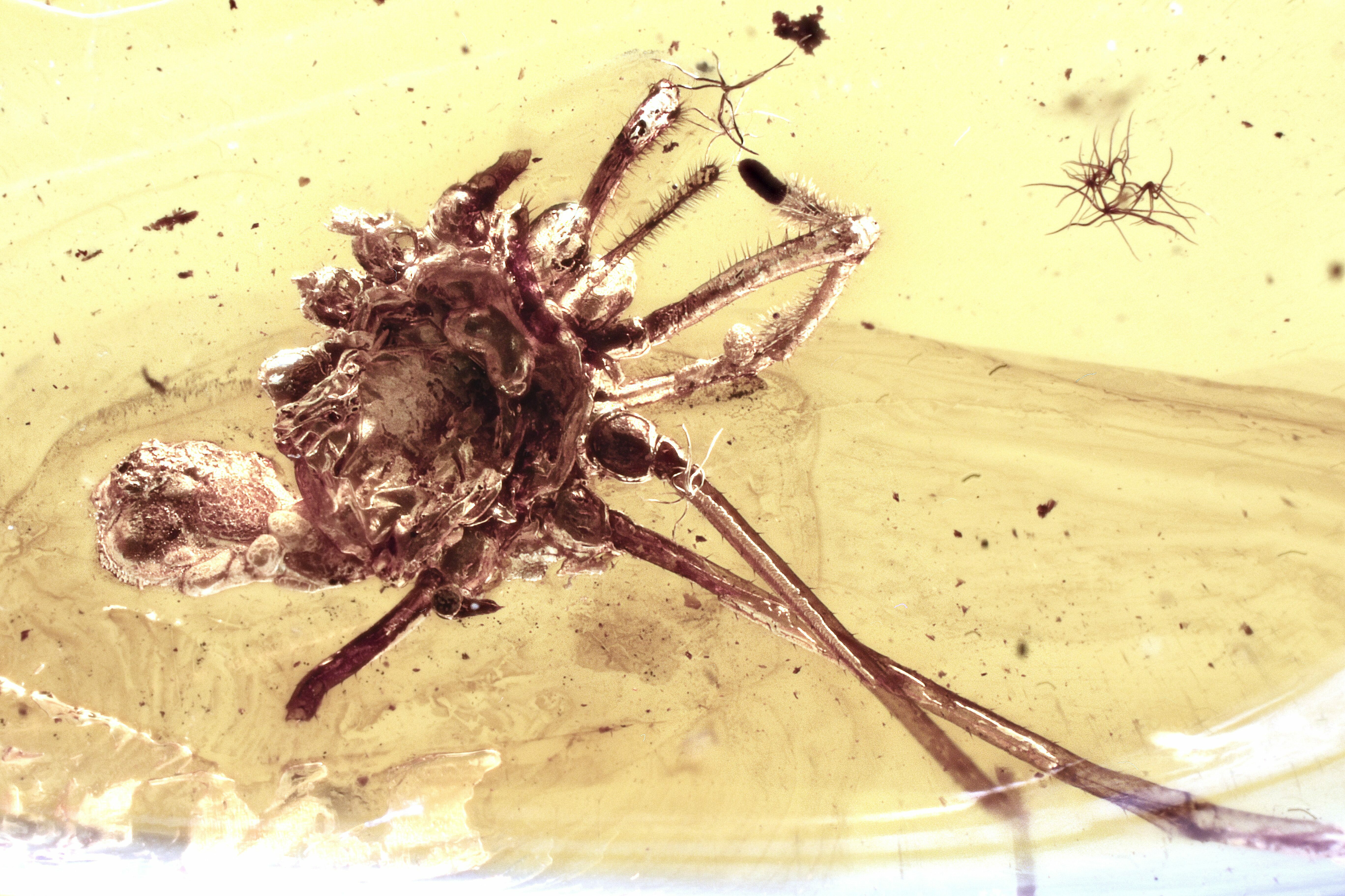 This is a 44 million year old fossil daddy long-leg spider (a.k.a. harvestmen spider - order Opiliones) preserved in Baltic amber. Most of its legs were lost prior to fossilization.