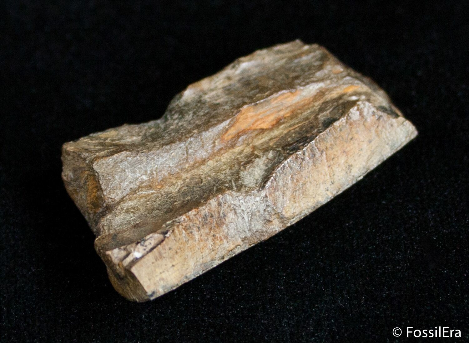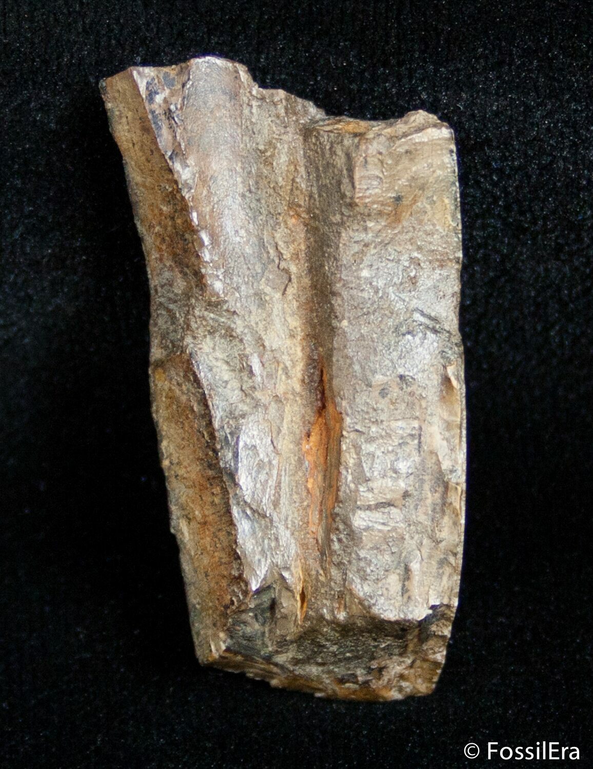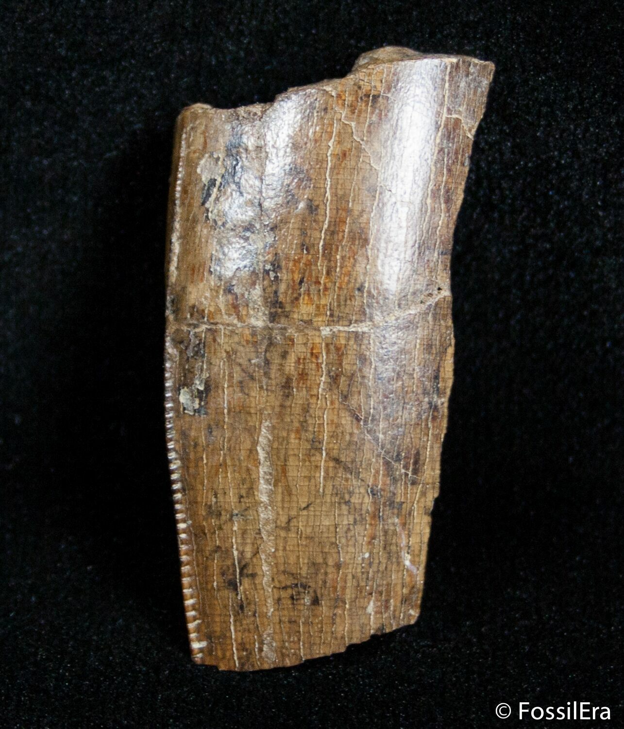 This is a section of a Tyrannosaurus tooth with great enamel preservations and fine serrations running along the size. This would have come from a fairly large tooth so it would have not been Nanotyrannus but rather T-Rex himself.