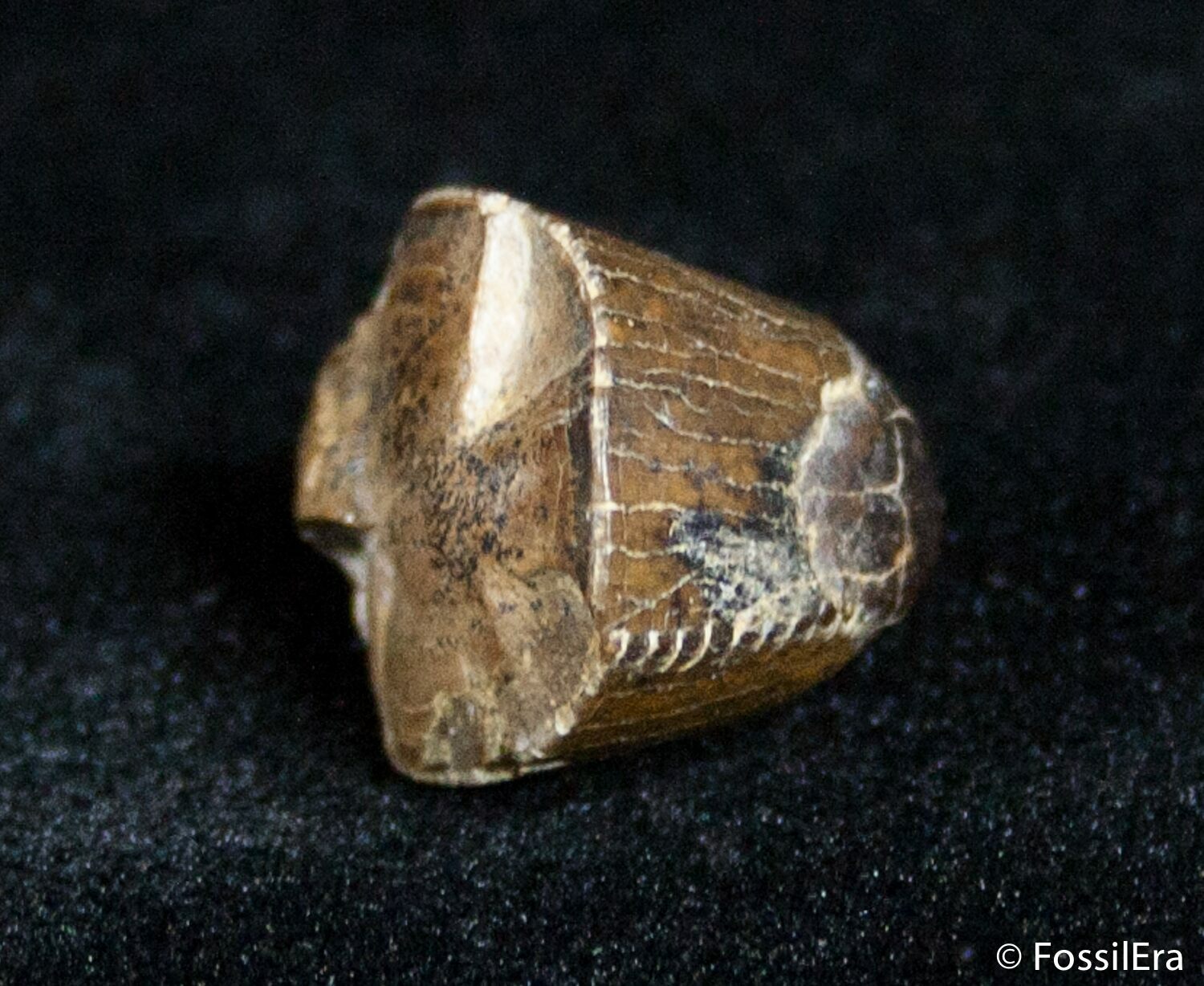 This is a Tyrannosaurid tooth tip with good serrations running along the side. It comes from a private dig on the Hell Creek Formation of Montana. It has very nice enamel preservation. Complete T-Rex teeth often run into the thousands of dollars so here's a chance to own part of an authentic one for a tiny fraction of that.
