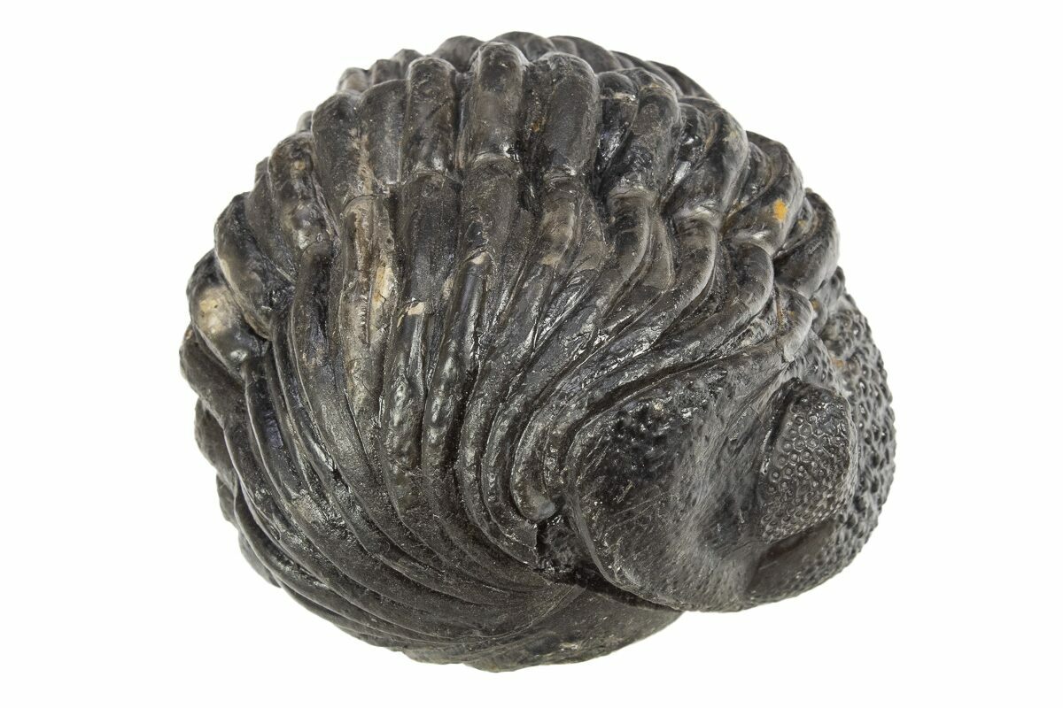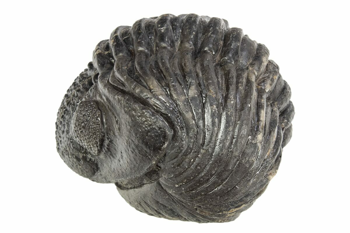 This is a perfectly enrolled specimen of the giant phacopid trilobite Drotops megalomanicus. It's 3" wide and would be around 5 1/2" long if outstretched. It has been completely removed from the surrounding limestone and all of the surface detail including the bumps covering its head and tail and many eye facets can easily be seen. It has about 10% shell restoration in total, primarily on the right hand side of its thorax and tail.