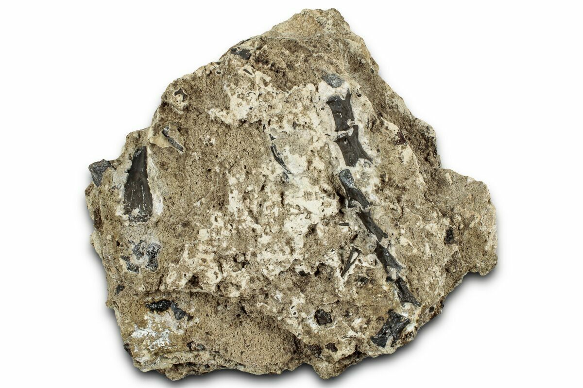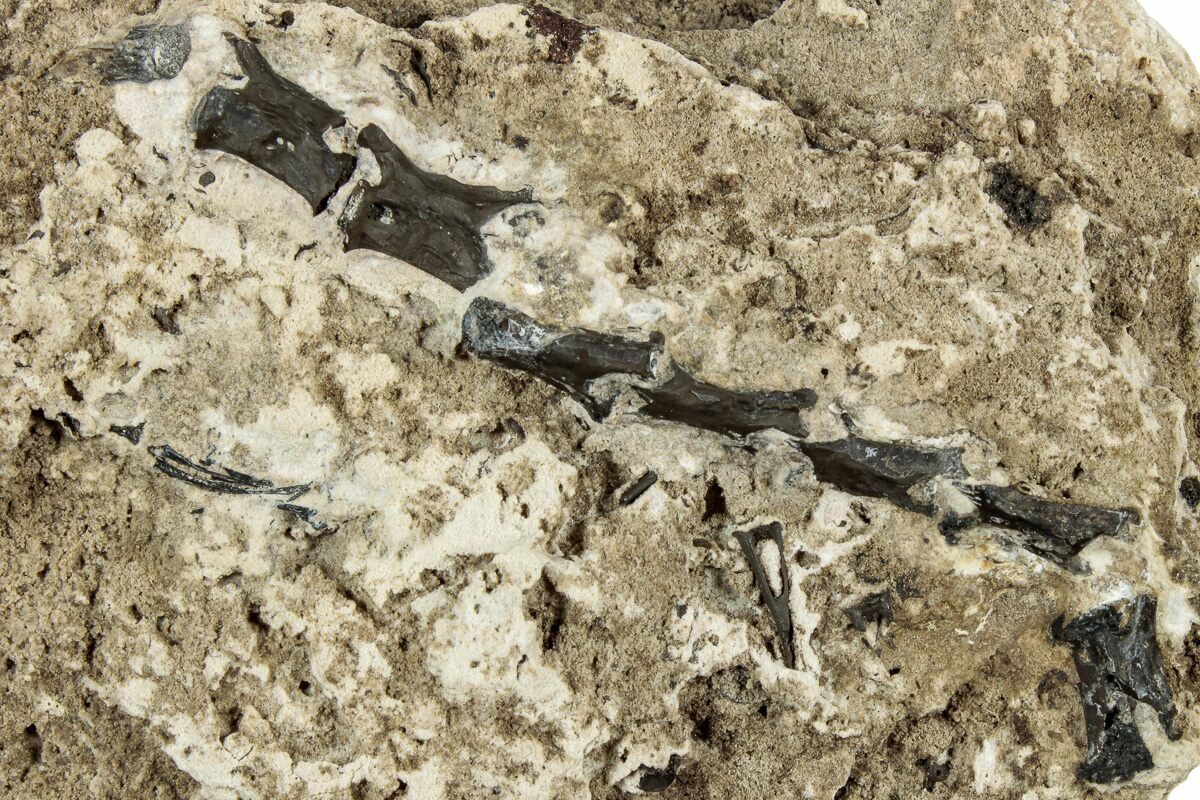 Here we have a 4.6" wide section of rock containing articulated vertebrae and countless other complete and partial bones of Lower Permian aged reptiles, collected from the Arckbuckle Group near Lawton, Oklahoma. Additional prep work could expose many more of these bones, along with the partial jaw along the underside of the rock. This permian reptile material is found within cave fissure fill deposits, and this specimen likely comes from Richard's Spur Quarry.