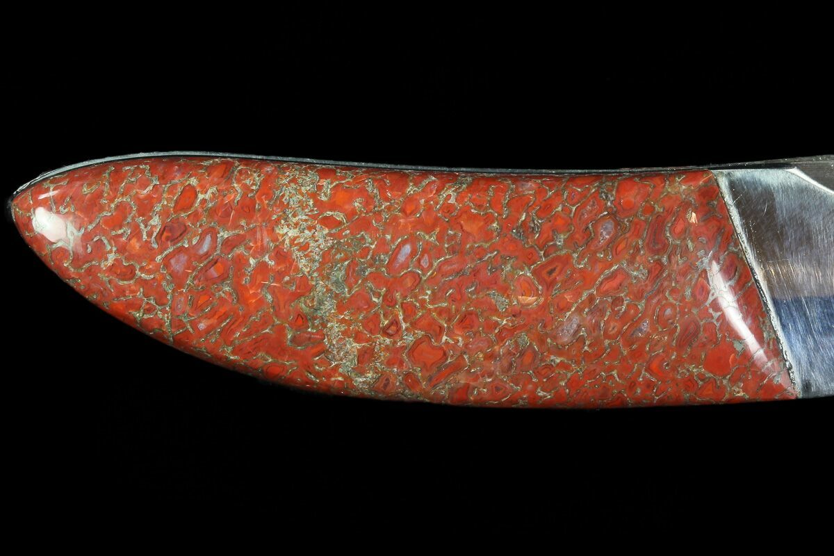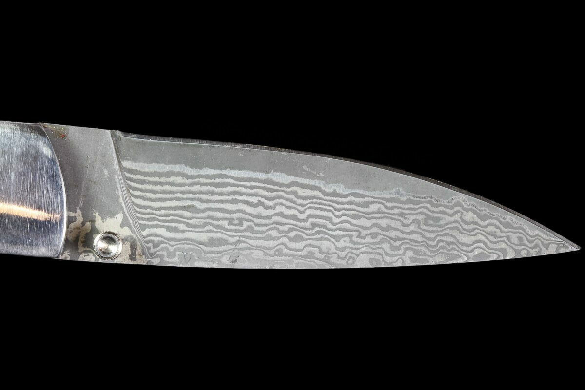 This is a beautiful folding pocketknife inlaid with polished, 150 million year old agatized fossil dinosaur bone. The inlays were handcrafted in Utah. The internal cell structure of the dinosaur bone can clearly be seen. This knife also features a stunning Damascus steel blade.