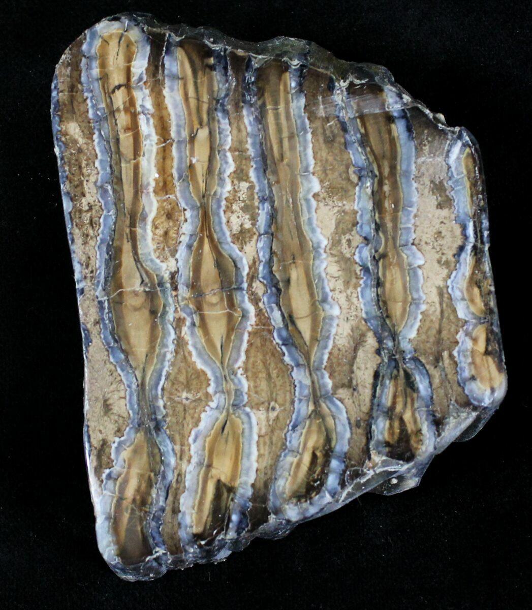 This is a cut and polished section of a Mammoth (Mammuthus primigenius) molar from the North Sea deposits off the coast of Denmark. This tooth has been cut and then polished to reveal the intricate color patterns and detail of the interior enamel and dentin structure.