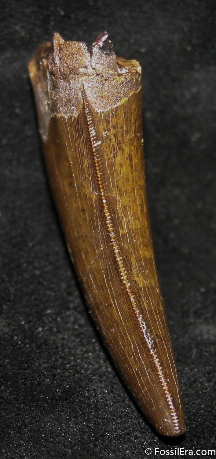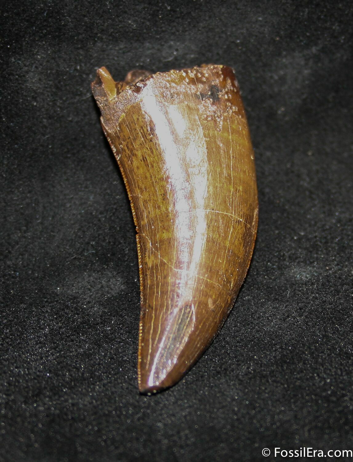 The tooth has amazing dark-brown enamel excellent serrations, a small portion of the root still attached and a nice tip. There has been a single repair to the tooth but no restoration. This is truly a quality Tyrannosaurid tooth from South Dakota.
