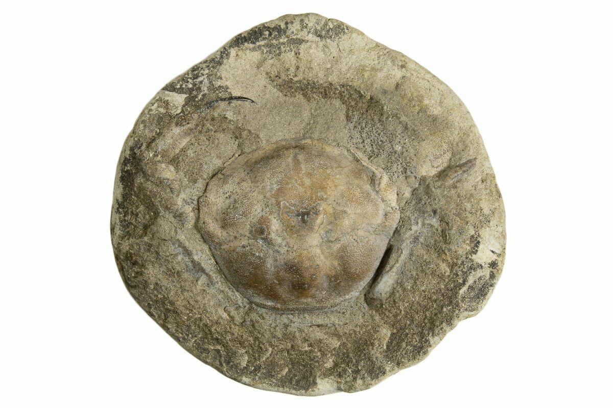 This is a Late Eocene aged nodule/concretion collected after eroding away from the Lincoln Creek Formation in Grays Harbor County, Washington State. It shows an exposed carapace of the species Branchioplax washingtoniensis. The nodule measures 3.2" long and the fossil could either be left as is or further exposed.