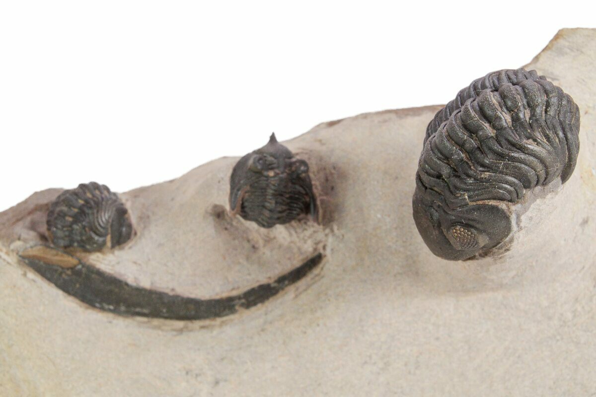 This is an association of three, chocolate-brown trilobite fossils collected from the Lhandar Formation near Lghaft, Morocco. There are two Reedops along with a small Pseudocryphaeus minimus. There is less than 1% restoration in total on this piece.
