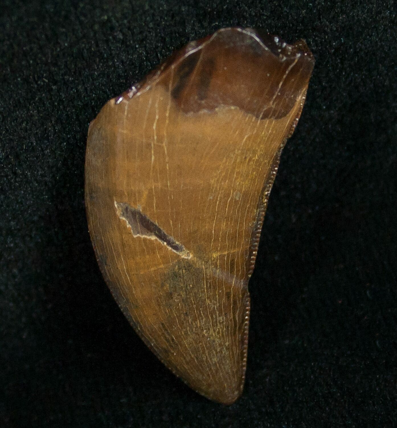 This tooth was found at a private ranch in Butte County, South Dakota earlier this summer. It comes from a quarry known as the "Tooth Draw Quarry" that has produced many high quality dinosaur teeth over the past several decades. In the Late Cretaceous some 65 million years ago, this quarry was located in a sub-tropical floodplain that would have been similar to modern day coastal Louisiana. It consists of 2 meters of alternating sandstone and gravel, representing a river channel lag deposit. It contains many isolated dinosaur teeth including T-Rex, Nanotyrannus, Raptors and Triceratops, but teeth of this high quality are rare finds.