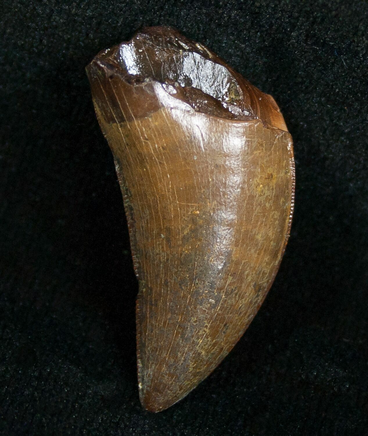 This is an excellent quality, Nanotyrannus lancensis tooth from the Hell Creek Formation of South Dakota. It's 1.24 inches in length, has great enamel, fine serrations and no repair or restoration. It comes with a riker mount display case.