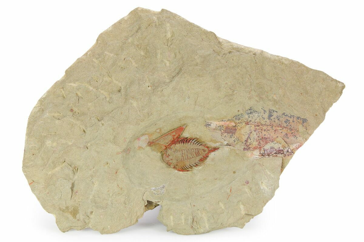 This is a rare, 1.2" long example of a small lichid (Parvilichas marochii) trilobite from the Fezouata Formation of Morocco. Parvilichas is similar to the monster lichid trilobite Uralichas but differs in that it is much smaller with proportionally larger eyes and longer genal spines. It is laying on top of a hyolithid.