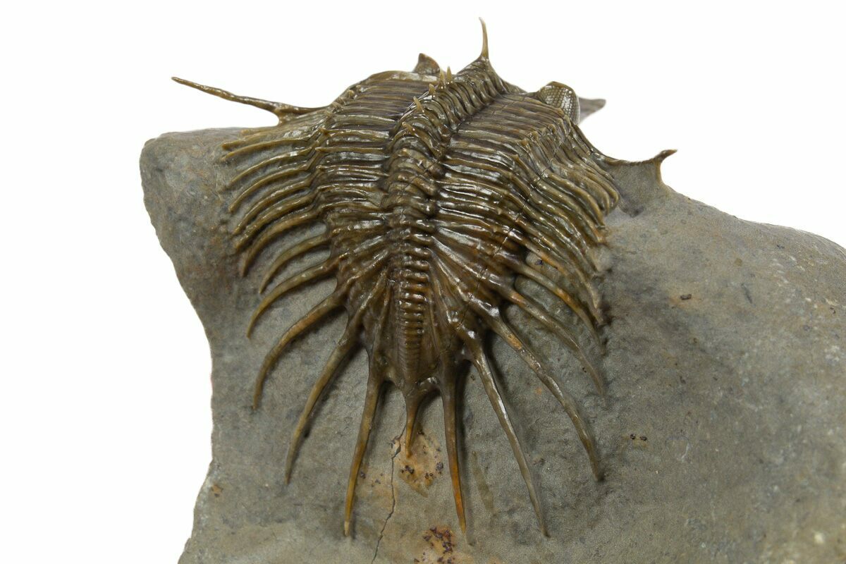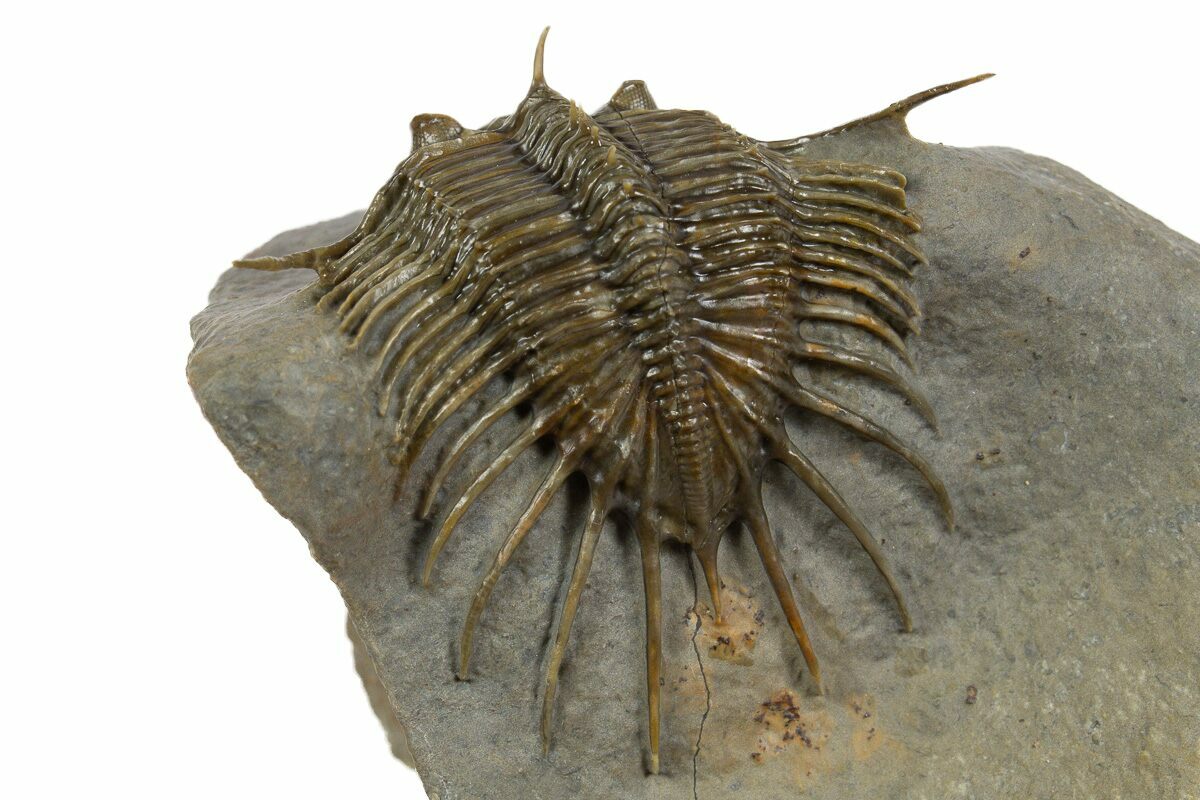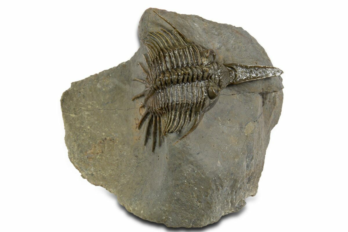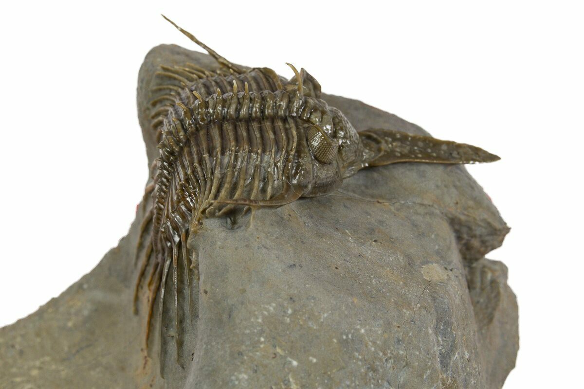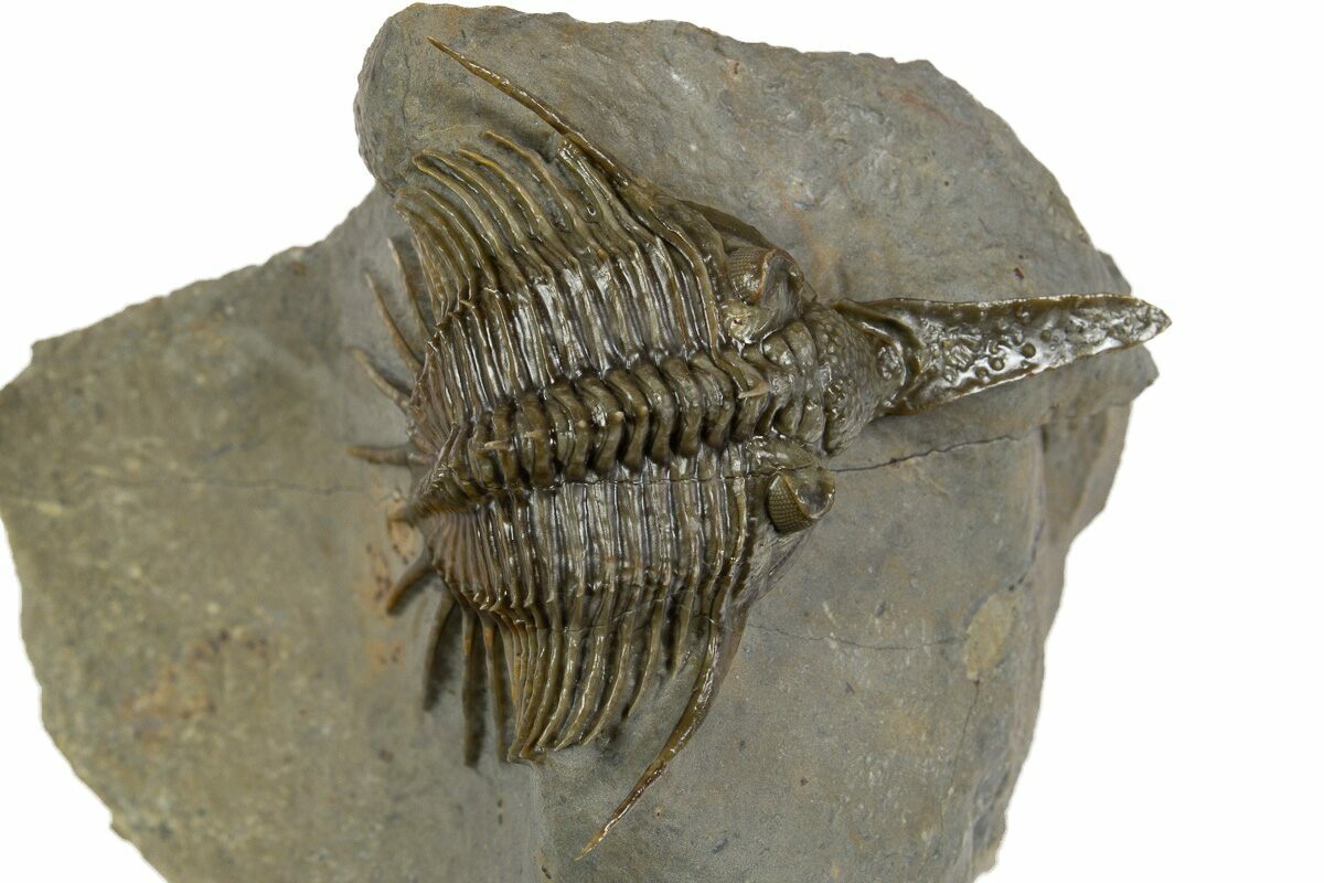 This is a rare, 2.8" long Psychopyge termierorum trilobite collected near Ofaten, Morocco. It is related to the more frequently seen Psychopyge elegans which comes from Issomour but has a much longer rostrum. This specimen is well prepared with dozens of tiny free-standing spines and and preserved eye facets in both eyes. There is about 2% shell restoration in total along repaired cracks.