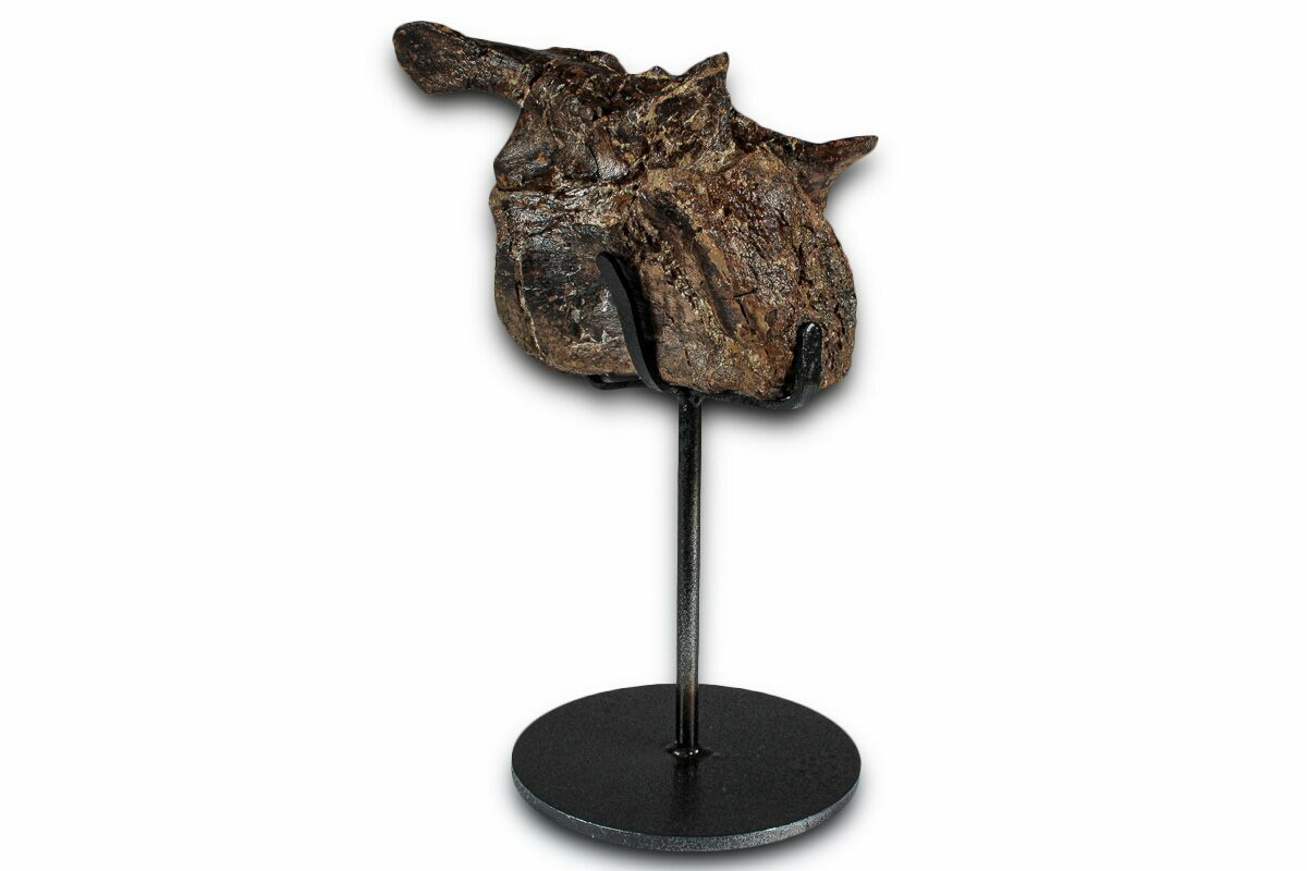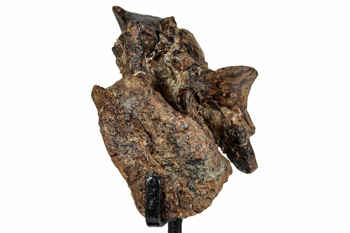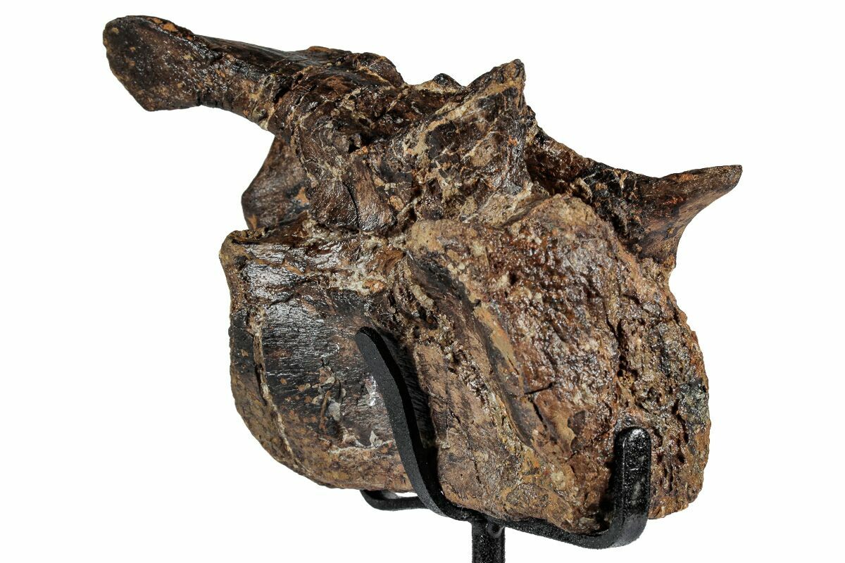 The vertebra has undergone some natural crushing and warping from geologic processes over millions of years. While there are a couple repaired cracks through the bone, very little gap fill restoration was required to piece the bone back together. The prezygapophyses and postzygapophyses, as well as the left diapophysis, are all natural and unrestored.