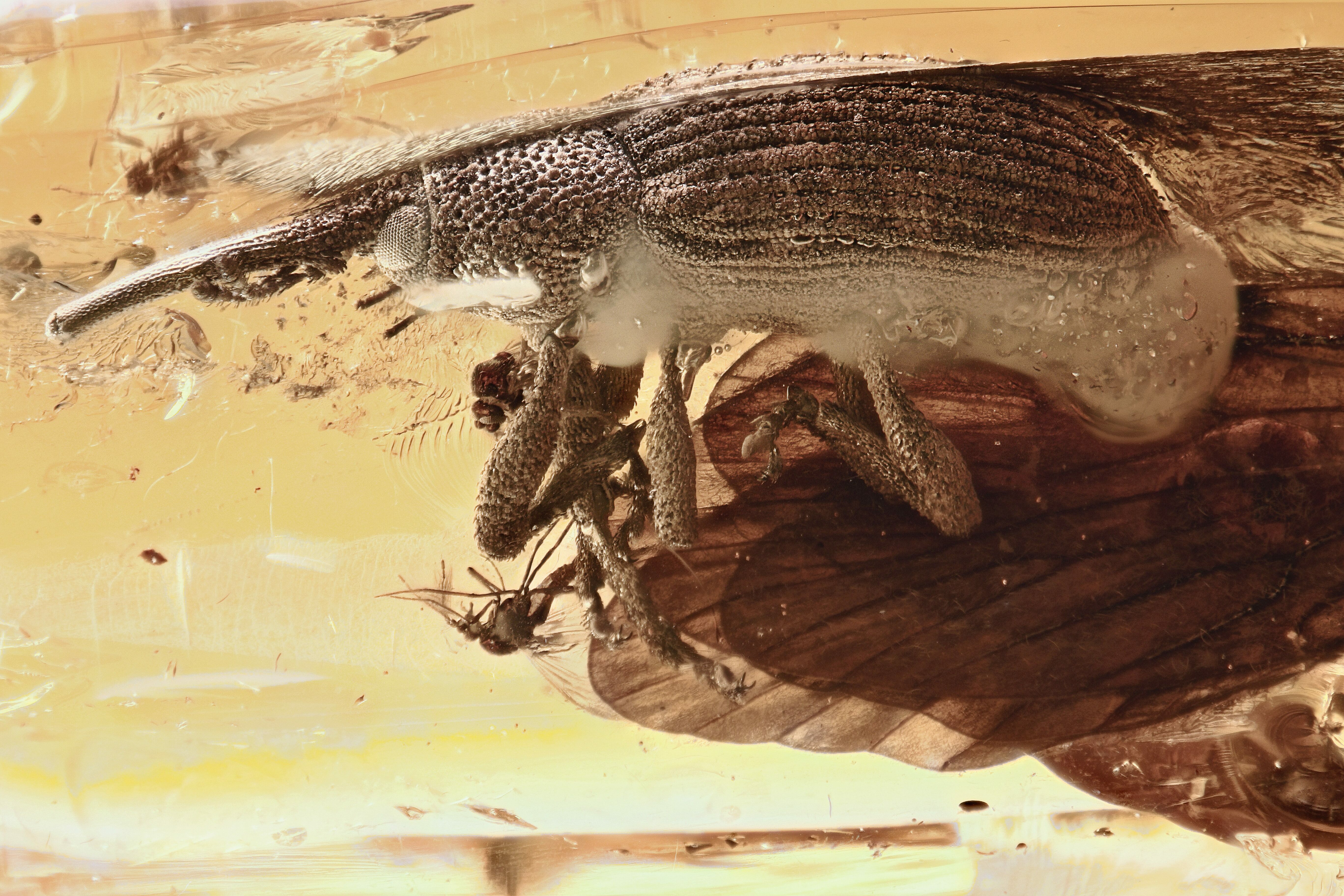 This is a beautifully detailed 44 million year old fossil snout beetle, a.k.a. "weevil" (order Coleoptera - family Curculionidae - genus Electrotribus) preserved alongside a nice caddisfly (order Trichoptera) and a swarm of 10 biting midges (family Ceratopogonidae) in Baltic amber. The weevil is about 10mm long and the caddisfly measures 22mm long including antennae and wings.