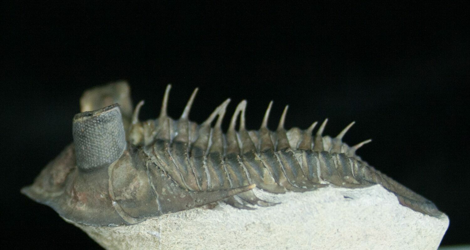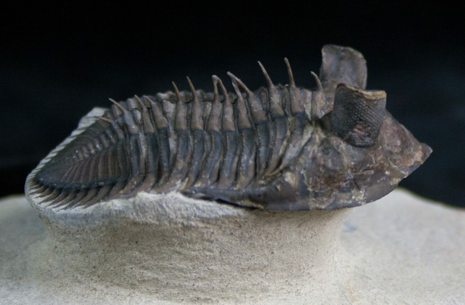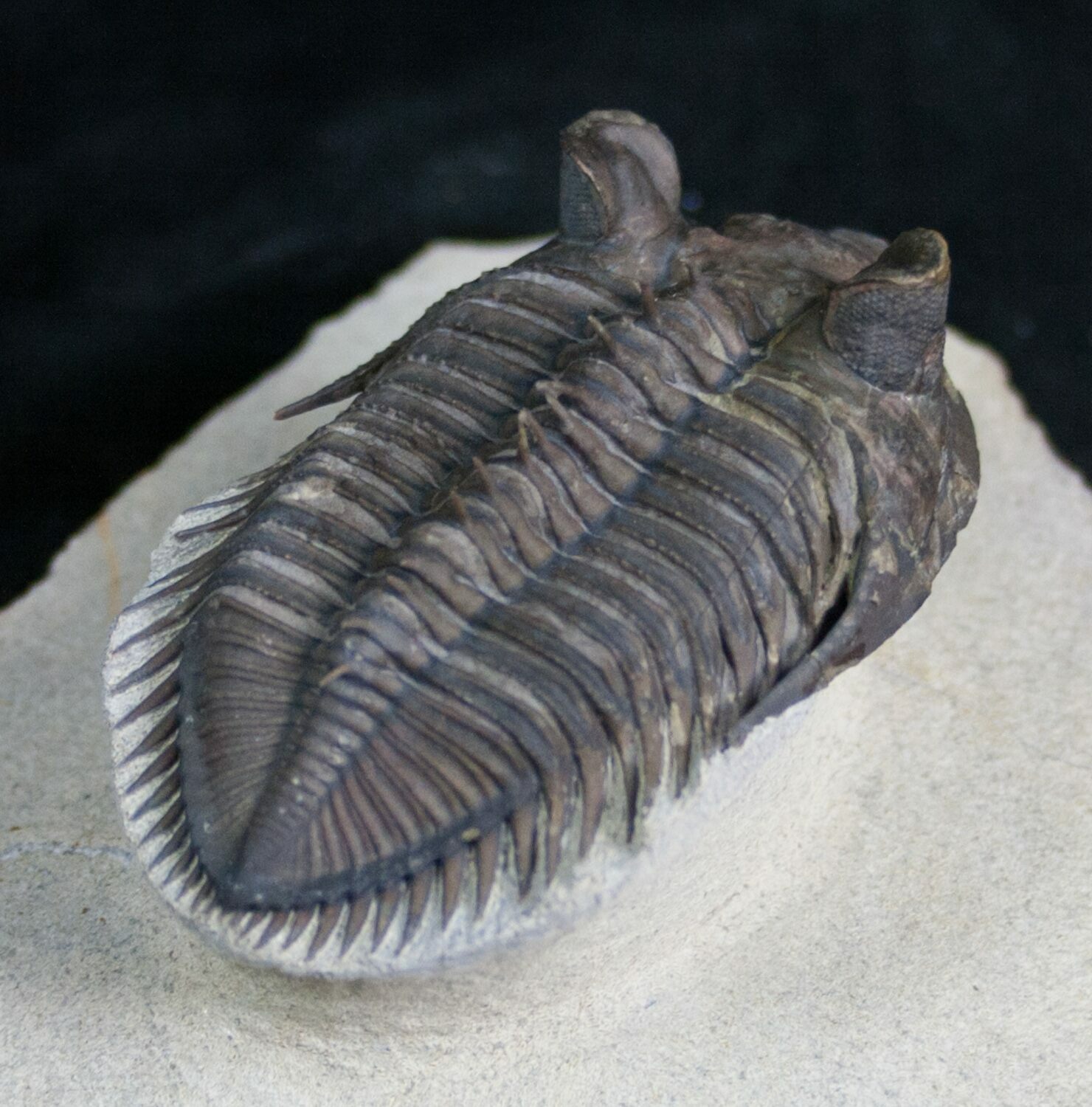 This a rare, tower-eye, Erbenochile issoumourensis trilobite from Foum zeguid, Morocco. This species has extraordinarily large eyes containing over 400 eye facets. The massive eyes allow full 360 degree coverage in the horizontal plane and were high enough to allow the trilobite to see backwards over its thorax.