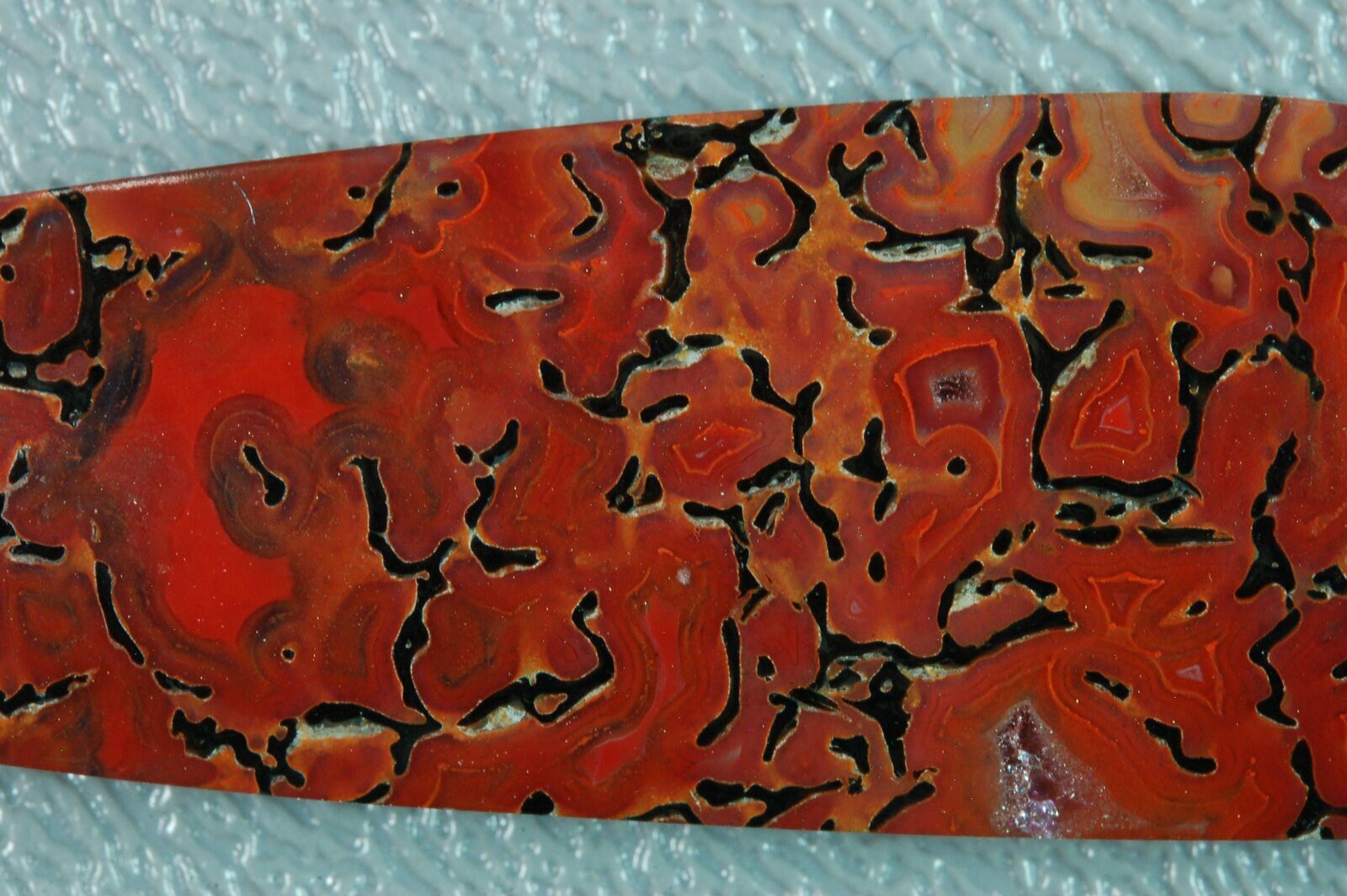 Dinosaur gembone, also known as agatized or fossilized dinosaur bone, is a rare and highly prized material formed when the porous structure of dinosaur bone is replaced by silica-rich minerals such as agate, chalcedony, or jasper over millions of years. This fossilization process preserves the intricate internal cell patterns of the original bone, which are often visible as vibrant, web-like structures under the polished surface.