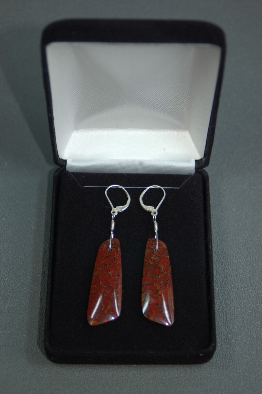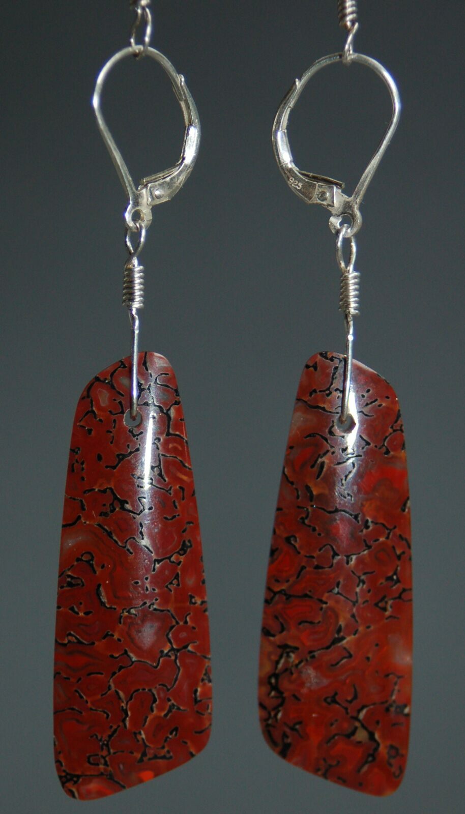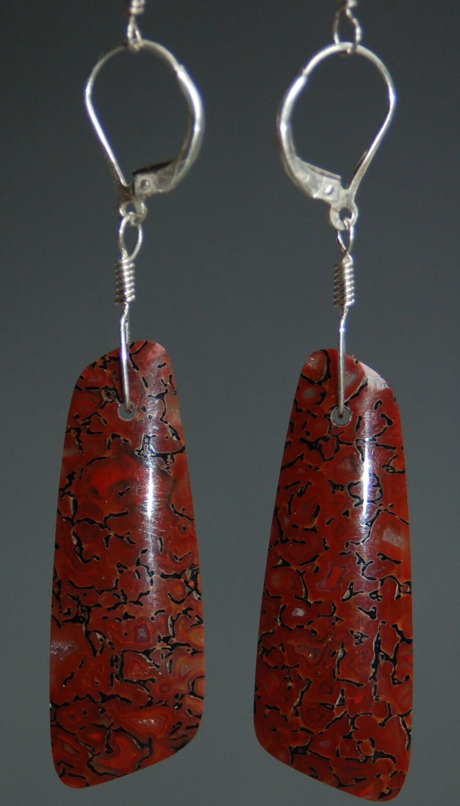 This is a beautiful set of earrings hand-crafted from 150 million year old, agatized dinosaur bone by master stone craftsman, Kenneth Kolb. The amazingly agatized cell structure of the bone creates a colorful, spiderweb like appearance with shades of bright red. This one of a kind set if earrings is 1-1/2" x 9/16" x 3/16" with silver findings. Less than 1% of all gem-grade dinosaur bone is of the quality used in this pair and it took over 6 hours of work to complete.