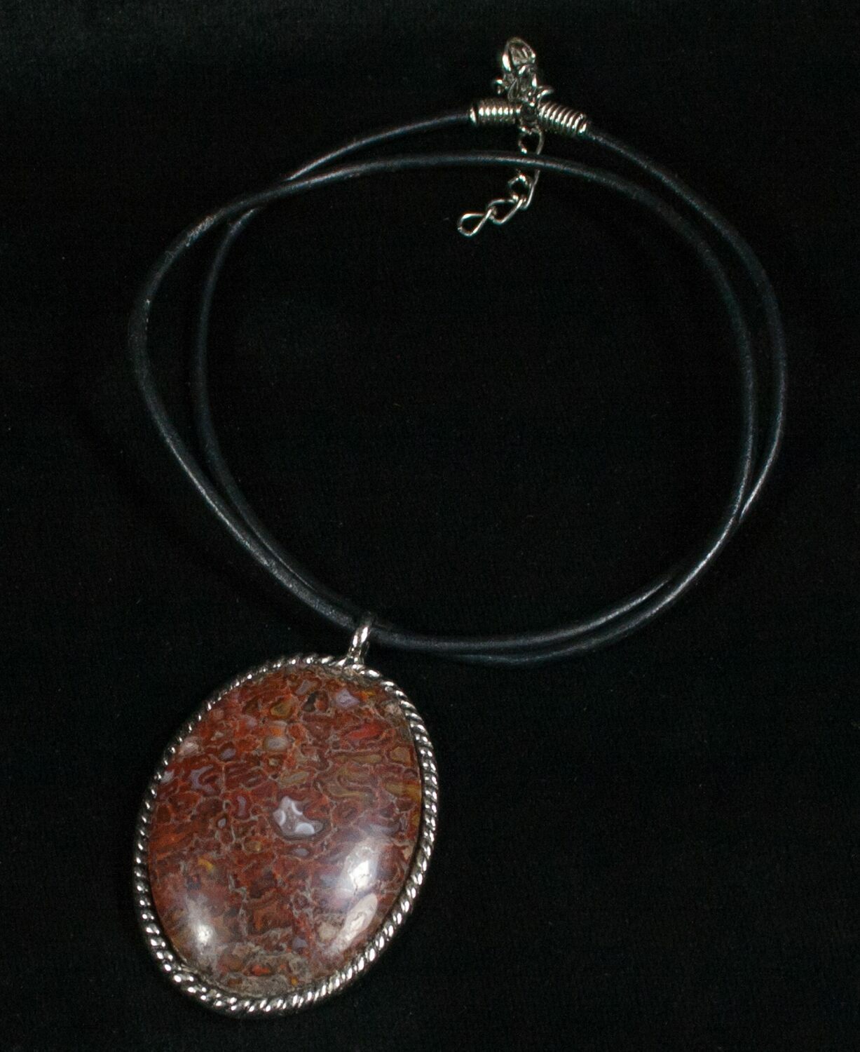 This is a stunning necklace made from 150 million year old, red, agatized dinosaur bone and handcrafted in Utah. The polished bone is 1.5" tall and the necklace is 20 inches around. The internal cell structure of the dinosaur bone can clearly be seen. Only high grade, gem quality bone was used in the pendants.