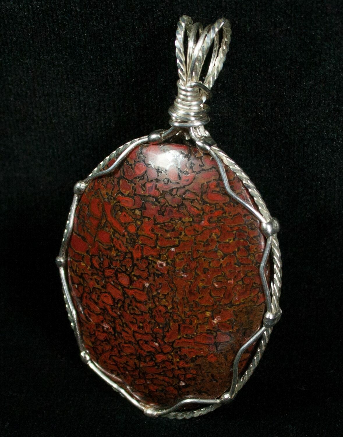 This is a stunning pendant made from 150 million year old, red, agatized dinosaur bone. It was handcrafted in Utah and wrapped in .925 sterling silver wire. The polished bone is 1.5" tall and the pendant has a total length of 2 1/4 inches. The internal cell structure of the dinosaur bone can clearly be seen. Only high grade, gem quality bone was used in the pendants.