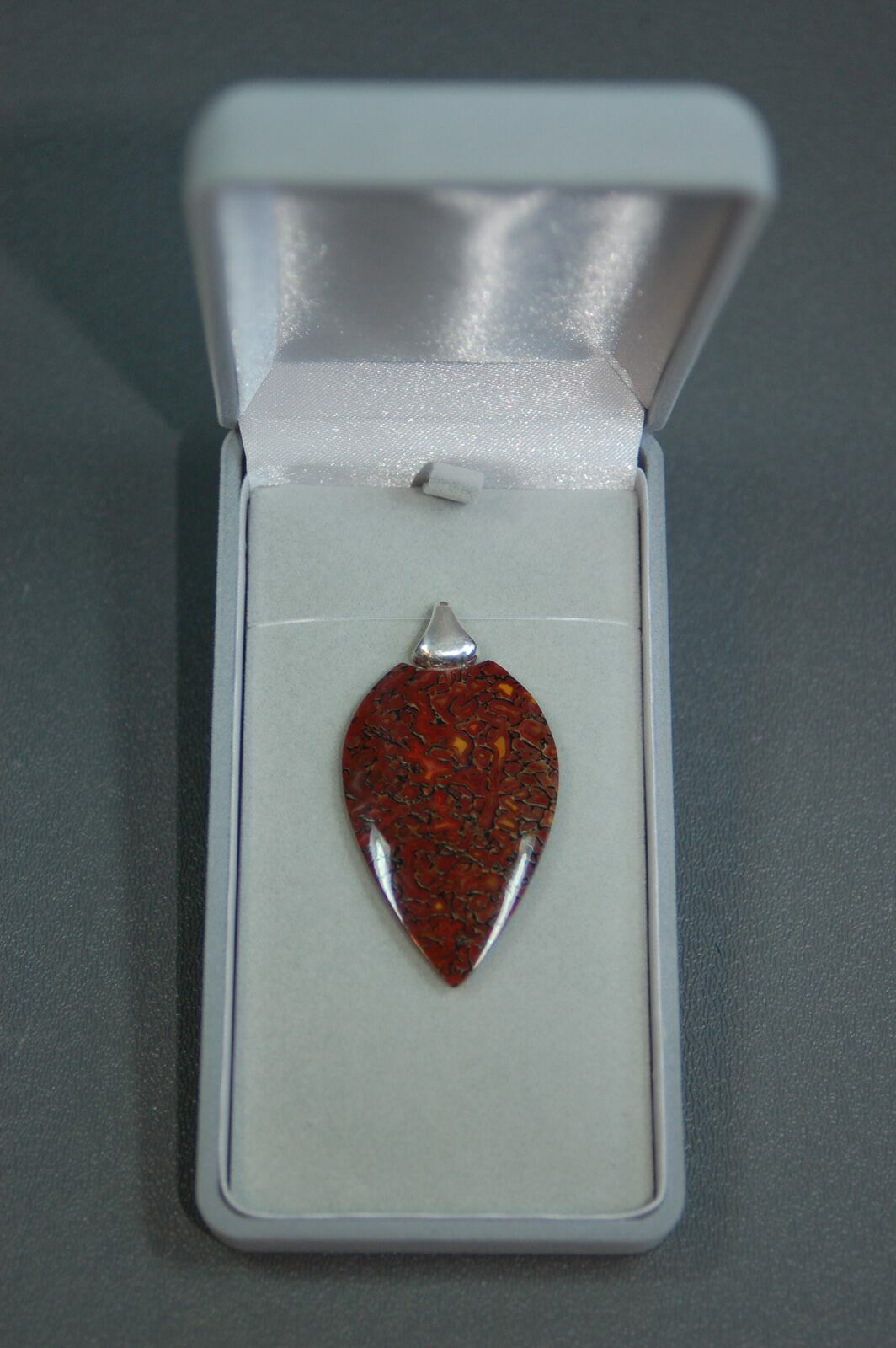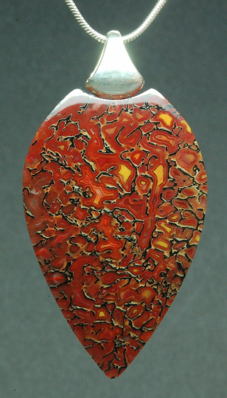 This is a gorgeous shield pendant hand-crafted from 150 million year old, agatized dinosaur bone by master stone craftsman, Kenneth Kolb. The amazingly agatized cell structure of the bone creates a red spiderweb like appearance. This one of a kind pendant is 1-1-3/4" x 1 1/8" x 1/4" and would make a unique gift.