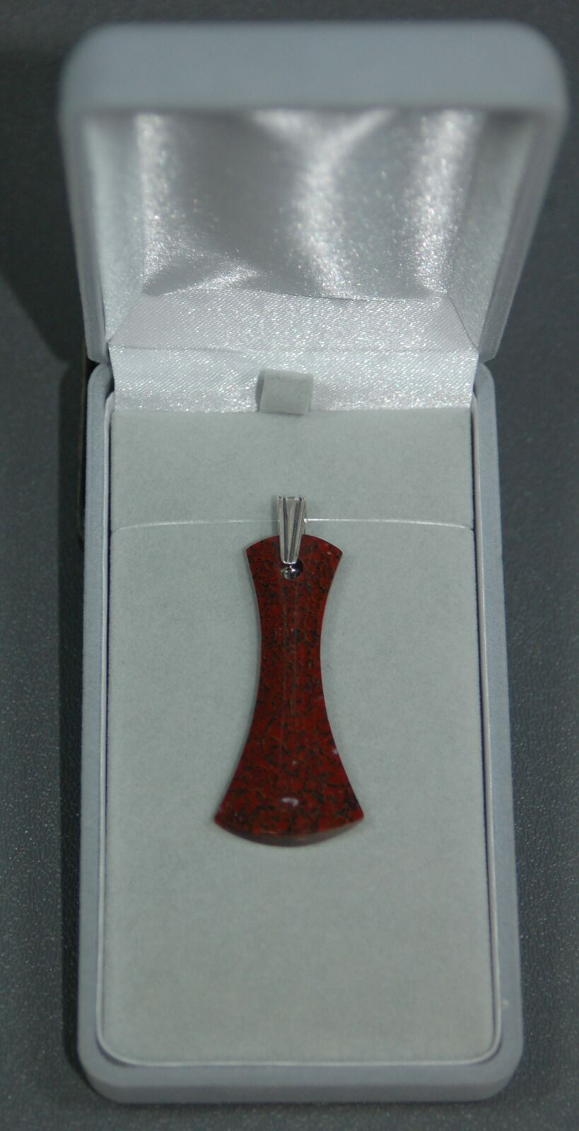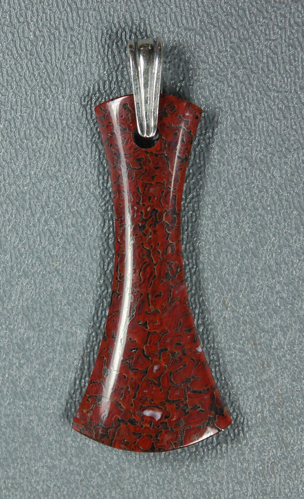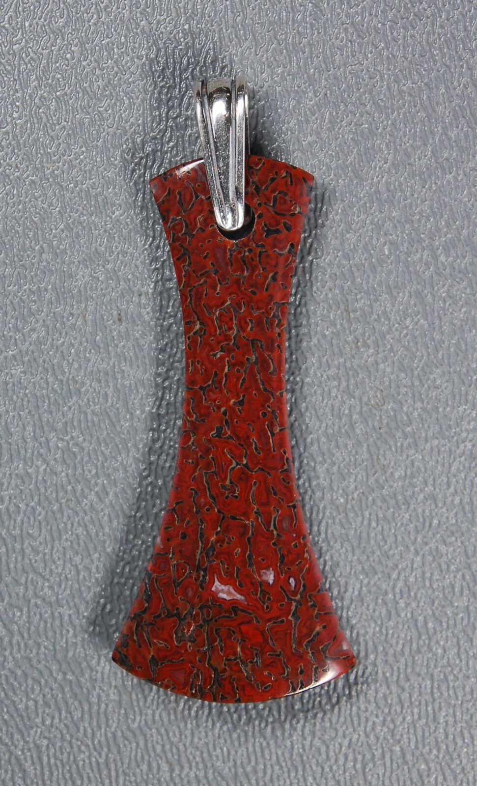 This is a gorgeous red, axe shaped pendant hand crafted from 150 million year old, agatized dinosaur bone (gembone) by master stone craftsman, Kenneth Kolb. The amazingly agatized cell structure of the bone creates a red spiderweb. This one of a kind pendant is 2 7/8" x 7/8" x 3/16"