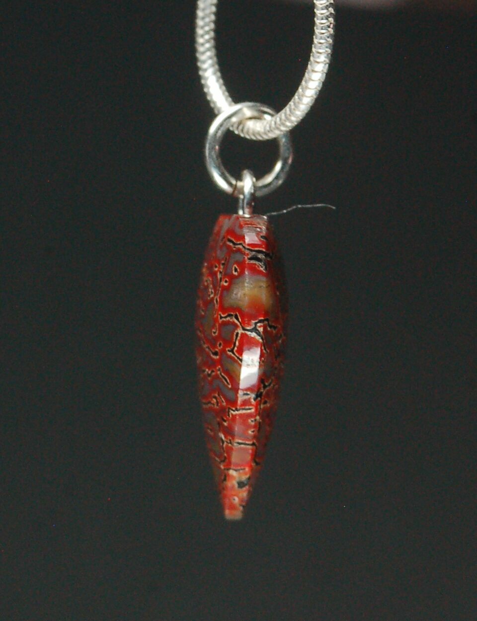This is a stunning, red, heart shaped pendant hand crafted from 150 million year old, agatized dinosaur bone (gembone) by master stone craftsman, Kenneth Kolb. The quality of the gembone is exceptional with great color and patterning.