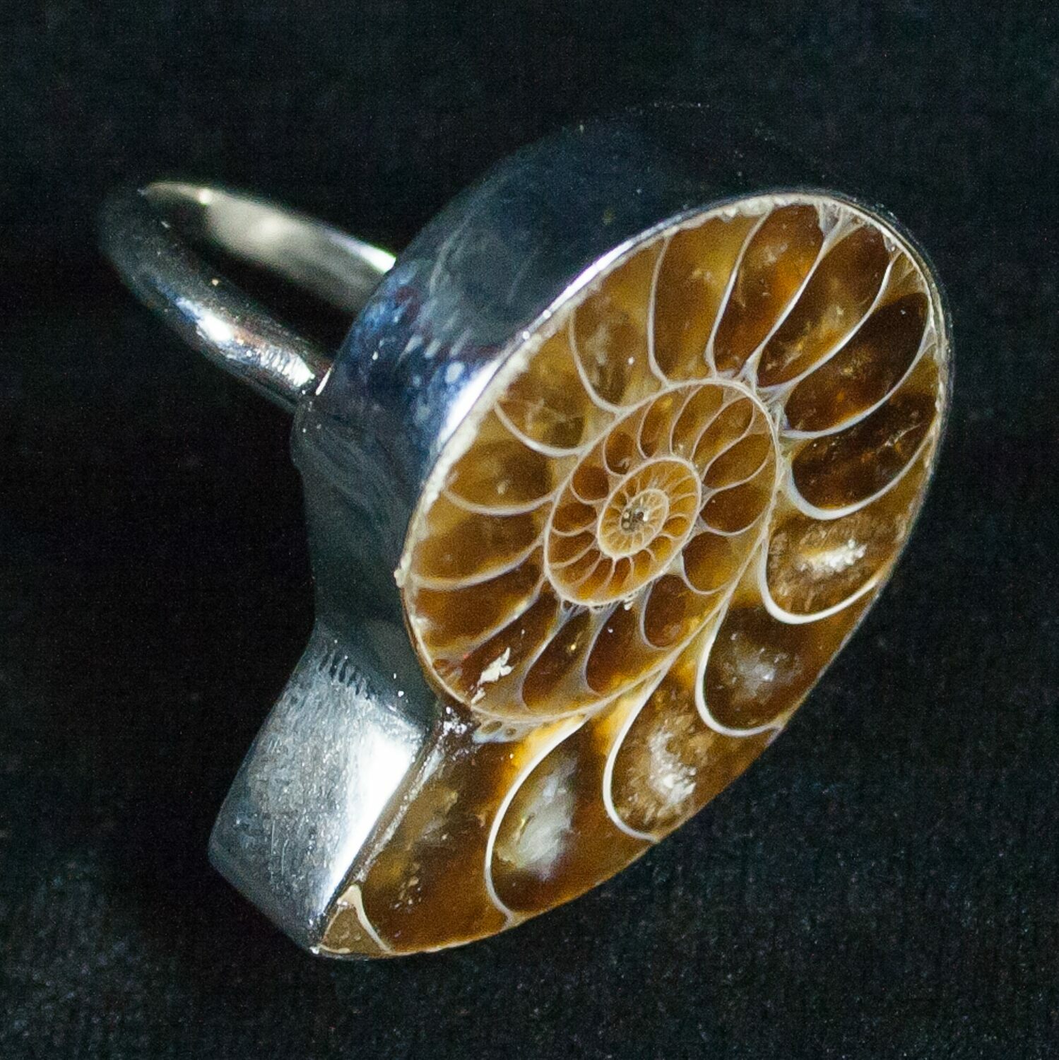 Here is a unique piece of jewelry featuring a real cut and polished ammonite fossil from Madagascar. The 1.25 inch wide ammonite approximately 110 million years old and from the genus Desmoceras.