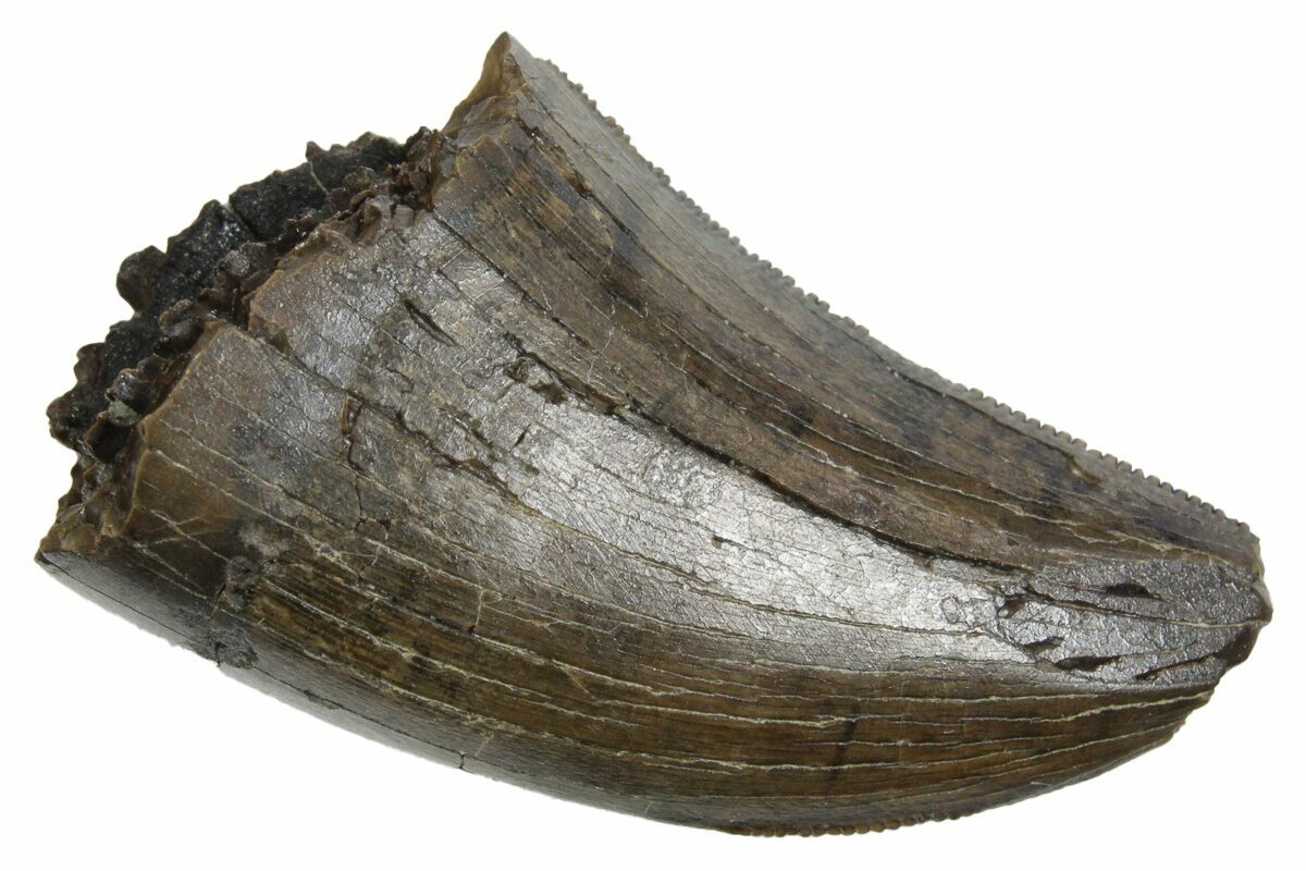 This is a robust, 1.01" long, tyrannosaur tooth from the genus Nanotyrannus, collected from the Hell Creek Formation in Garfield County, Montana. There is wear/damage to the tip and what appears to be glue stabilization to the enamel at the basal end, but this hefty tooth retains visible serrations and offers a wonderful opportunity to own a genuine specimen from this intriguing tyrannosaur.