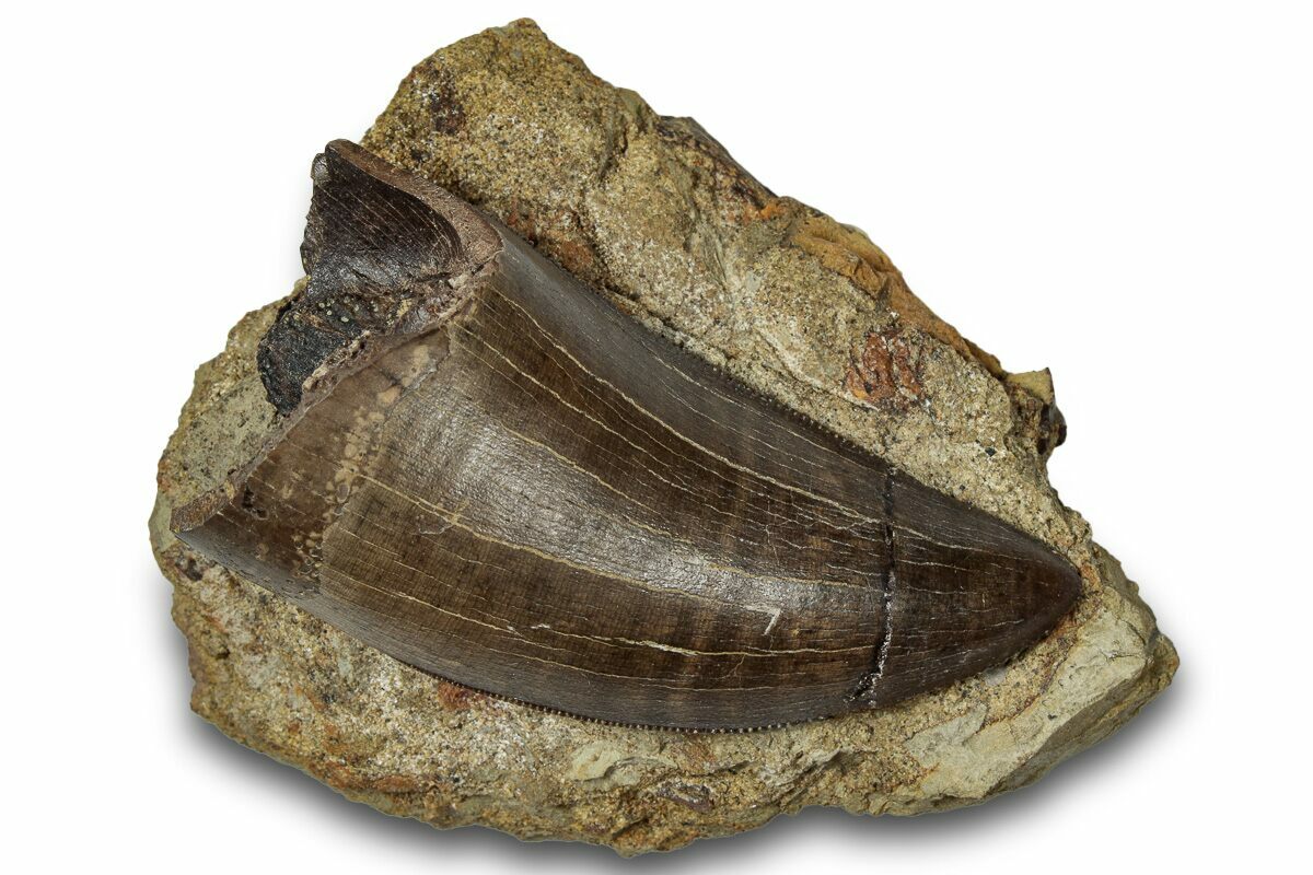This is a robust 2.31" long tooth from Tyrannosaurus rex, collected from the Lance (Creek) Formation of Wyoming. It has gorgeous serrations along both edges and outstanding enamel preservation. It has been left attached to the rock in which it was found. True T. rex teeth are some of the most sought-after and collectible fossils out there.