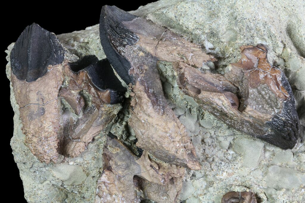 This is an incredible cluster of rooted Triceratops horridus teeth in sandstone. Five of these teeth have been partially exposed, three of which are in excellent condition. There is some minor chipping to the tip of one which hangs off of the edge. This is a truly phenomenal specimen.
