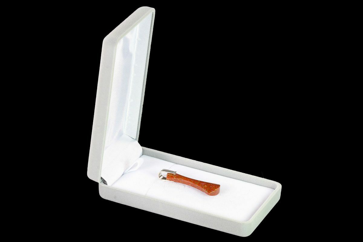 This is a stunning, 1.52" (not including loop) tall ruby red axe shaped pendant. It was hand crafted from 150 million year old, agatized dinosaur bone (gembone) by master stone craftsman, Kenneth Kolb.