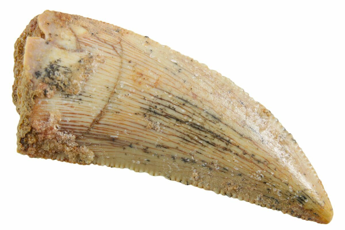 This is an authentic dinosaur tooth from the Late Cretaceous Kem Kem Beds (formerly Tegana Formation) of Morocco. These small theropod dinosaurs from the Tegana Formation have yet to be described, primarily due to a lack of articulated bone material found in the formation. That means it is impossible to provide a species or even genus ID from these teeth alone.