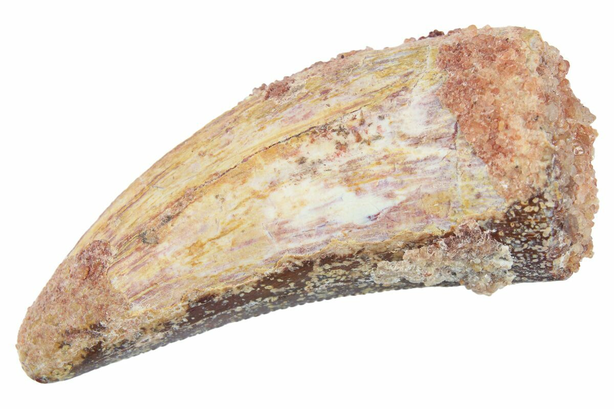 This type of tooth has a unique morphotype rarely found in the Kem Kem deposits. They usually measure between .5" and 1" long, have prominent serrations along the distal carinae, small serrations that are typically worn along the mesial carinae, and a very round base. The mid-line of their distal edge often contains an average of 14 to 17 serrations per 5mm, varying based on size of the tooth.