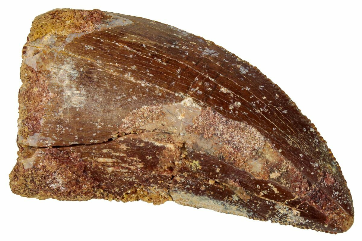 This is a serrated, 1.62" long tooth of a sub-adult Carcharodontosaurus from the Late Cretaceous-aged Kem Kem Beds of Morocco. Carcharodontosaurus was a massive predatory dinosaur larger than Tyrannosaurus rex.