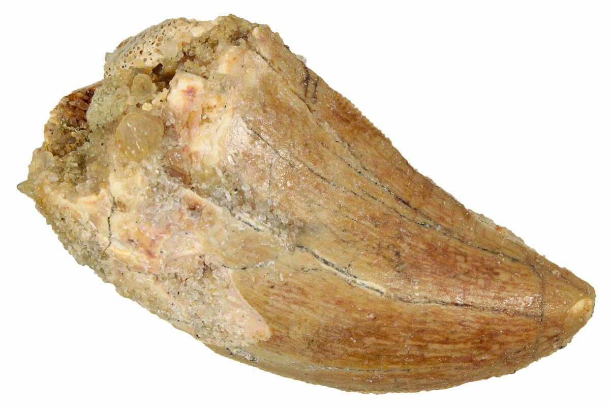 This is a serrated, 1.73" long tooth of a sub-adult Carcharodontosaurus from the Late Cretaceous-aged Kem Kem Beds of Morocco. Carcharodontosaurus was a massive predatory dinosaur larger than Tyrannosaurus rex.