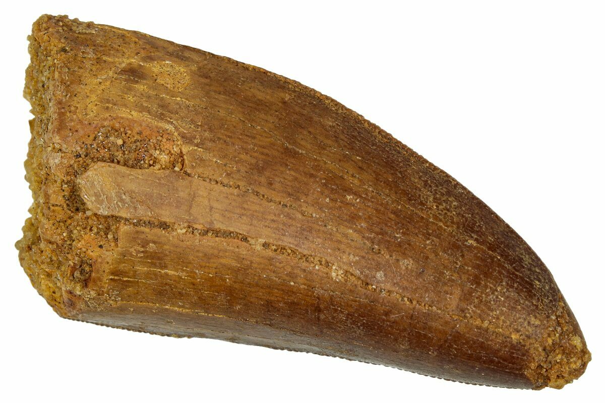 This is a serrated, 1.88" long tooth of a sub-adult Carcharodontosaurus from the Late Cretaceous-aged Kem Kem Beds of Morocco. Carcharodontosaurus was a massive predatory dinosaur larger than Tyrannosaurus rex.