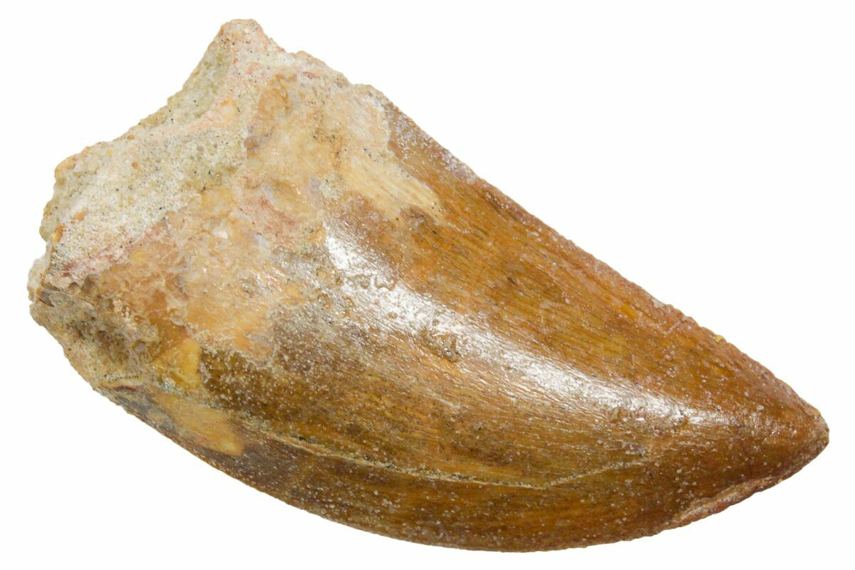 This is a serrated, 1.88" long tooth of a sub-adult Carcharodontosaurus from the Late Cretaceous-aged Kem Kem Beds of Morocco. Carcharodontosaurus was a massive predatory dinosaur larger than Tyrannosaurus rex.