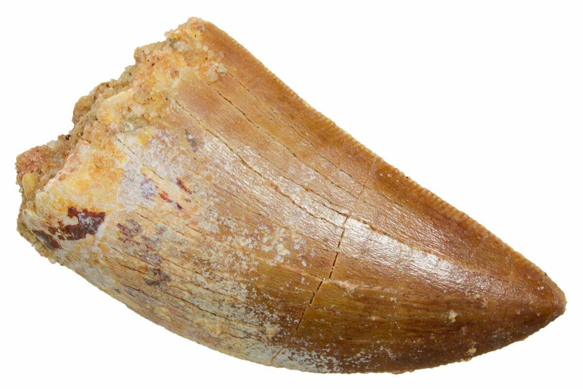 This is a serrated, 1.91" long tooth of a sub-adult Carcharodontosaurus from the Late Cretaceous-aged Kem Kem Beds of Morocco. Carcharodontosaurus was a massive predatory dinosaur larger than Tyrannosaurus rex.