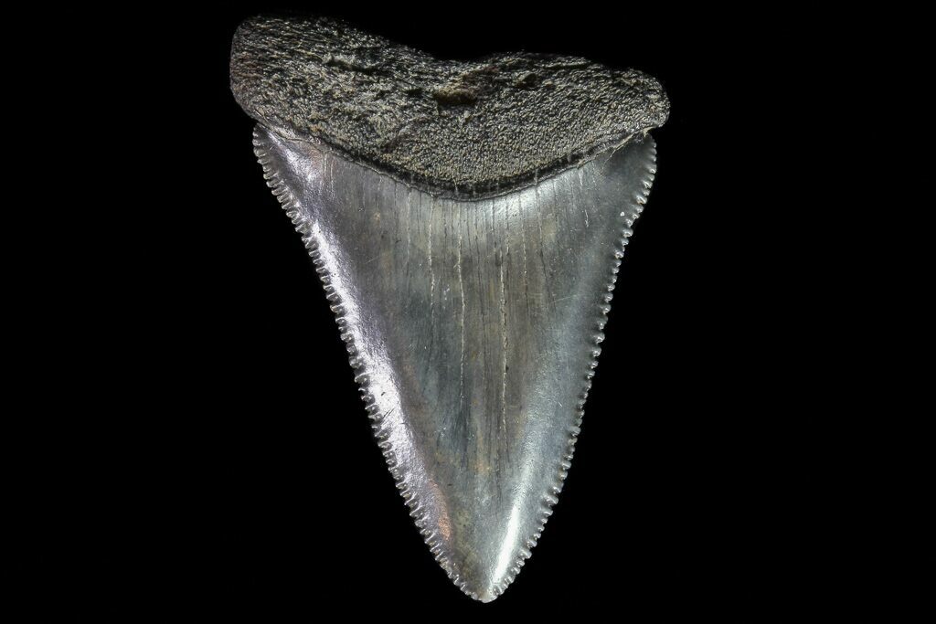 This is a serrated, 1.62" long fossil Great White Shark (Carcharodon carcharias) from Georgia. These fossil great white teeth are MUCH rarer than the Megalodon teeth which they are associated with.