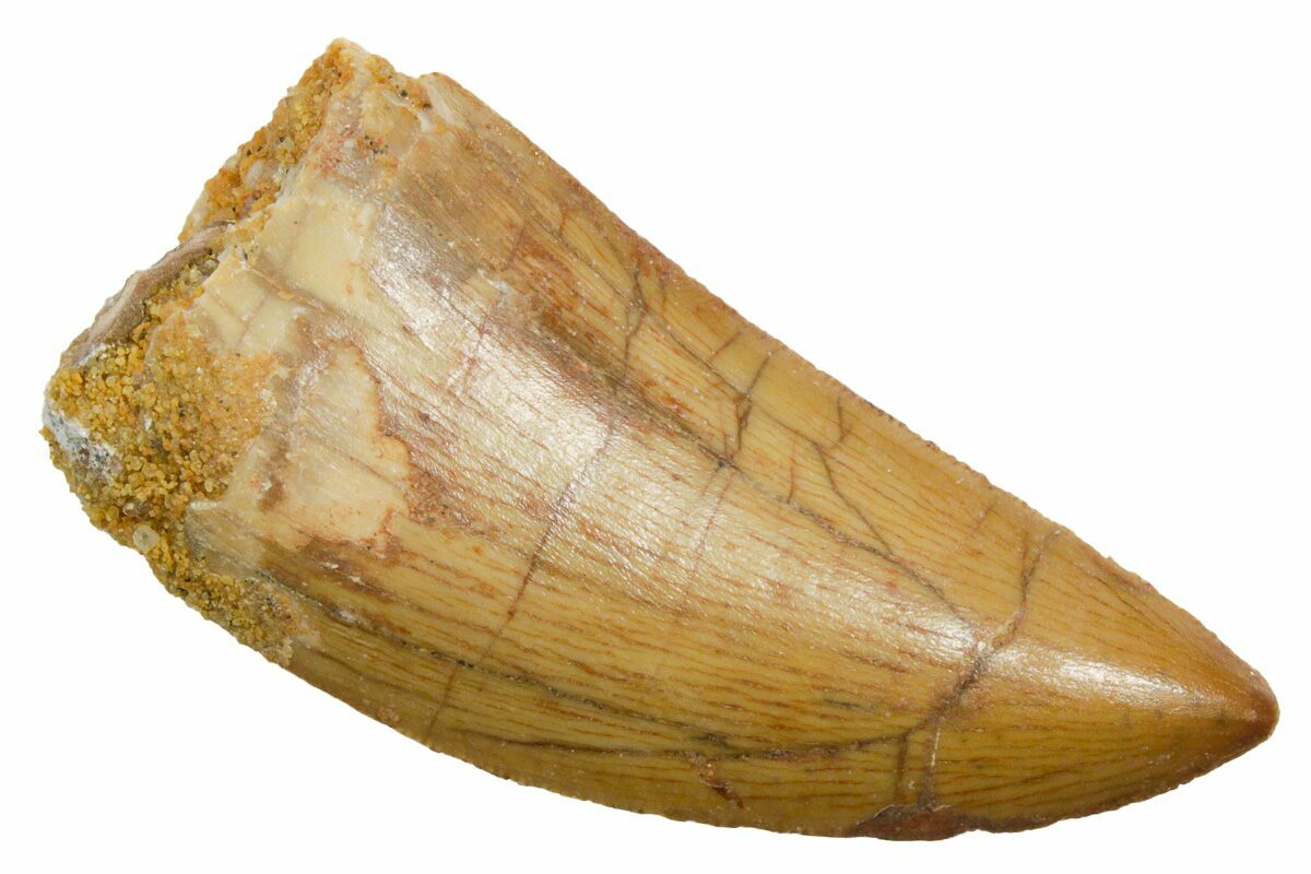 This is a serrated, 1.98" long tooth of a sub-adult Carcharodontosaurus from the Late Cretaceous-aged Kem Kem Beds of Morocco. Carcharodontosaurus was a massive predatory dinosaur larger than Tyrannosaurus rex.