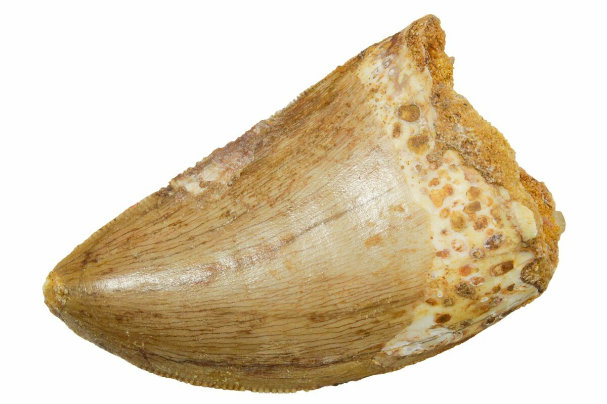 This is a serrated, 2.00" long tooth of a sub-adult Carcharodontosaurus from the Late Cretaceous-aged Kem Kem Beds of Morocco. Carcharodontosaurus was a massive predatory dinosaur larger than Tyrannosaurus rex.