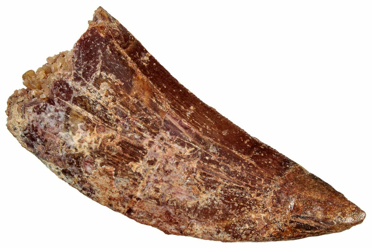 This is a serrated, 2.06" long tooth of a sub-adult Carcharodontosaurus from the Late Cretaceous-aged Kem Kem Beds of Morocco. Carcharodontosaurus was a massive predatory dinosaur larger than Tyrannosaurus rex.