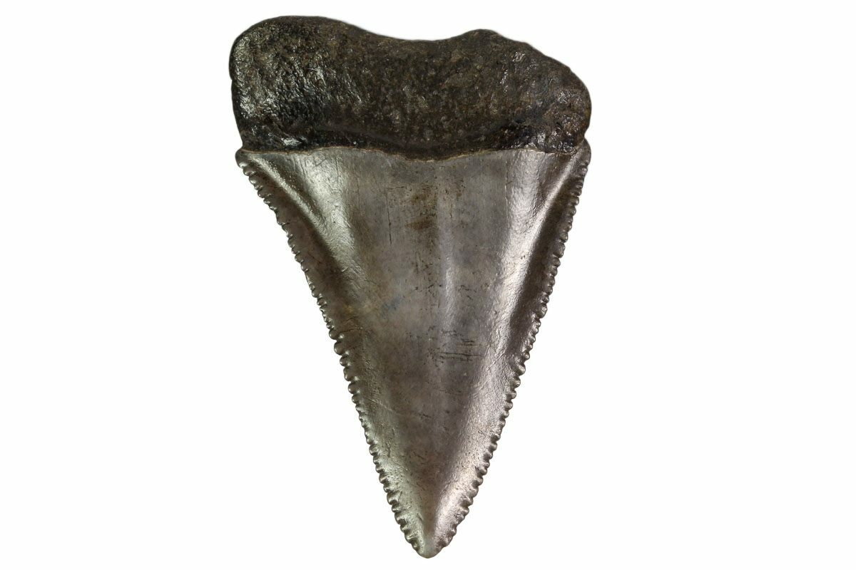 This is a serrated, 2.12" long fossil Great White Shark (Carcharodon carcharias) from Georgia. These fossil great white teeth are MUCH rarer than the Megalodon teeth which they are associated with. This one has nice serrations and only minor root erosion compared to most examples that have heavily eroded roots.